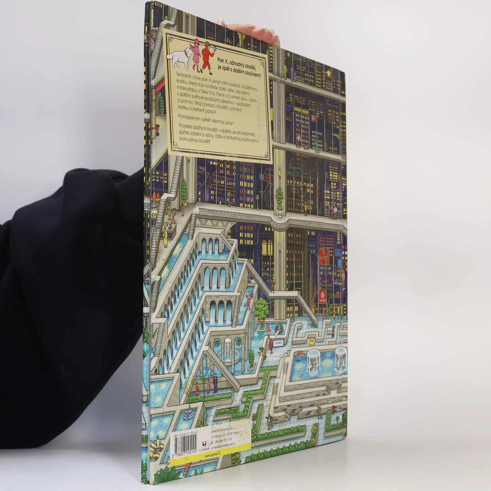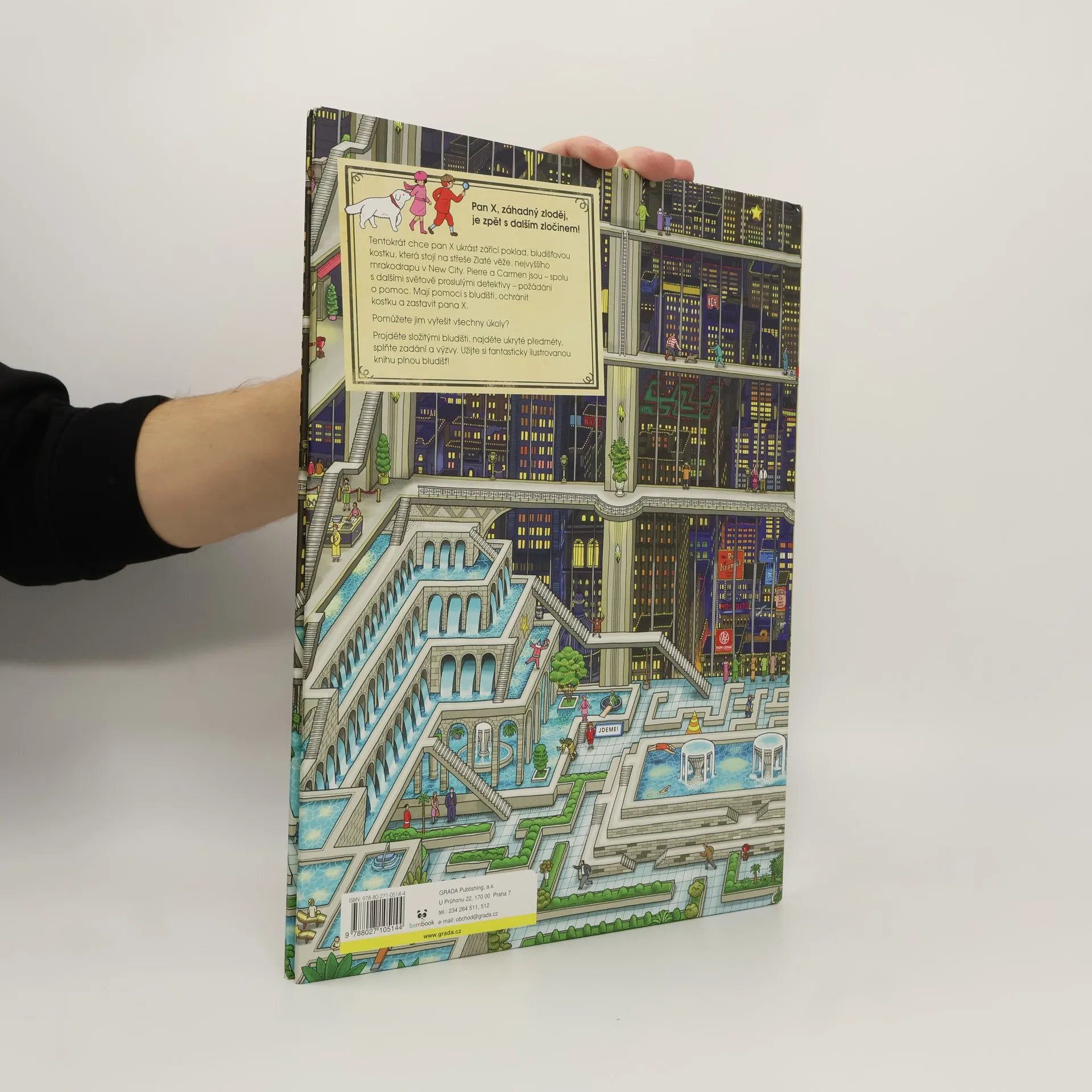 Tajemný zloděj pan X je zpět a má další nebezpečný plán! Chce ukrást největší poklad Nového města - zářící bludišťovou kostku z vrcholu Zlaté věže. Vlastník věže povolá do města několik nejlepších detektivů včetně Pierra, specialisty na bludiště, a jeho kamarádky Carmen. Všichni se snaží drahocennou kostku zachránit a hlavně zastavit pana X. Ale stihnou to včas? Projdi si všechna ďábelsky složitá bludiště, najdi ukryté předměty, vyřeš zvláštní výzvy pana X a další drobné záhady na každé stráce této báječněilustrované knihy.