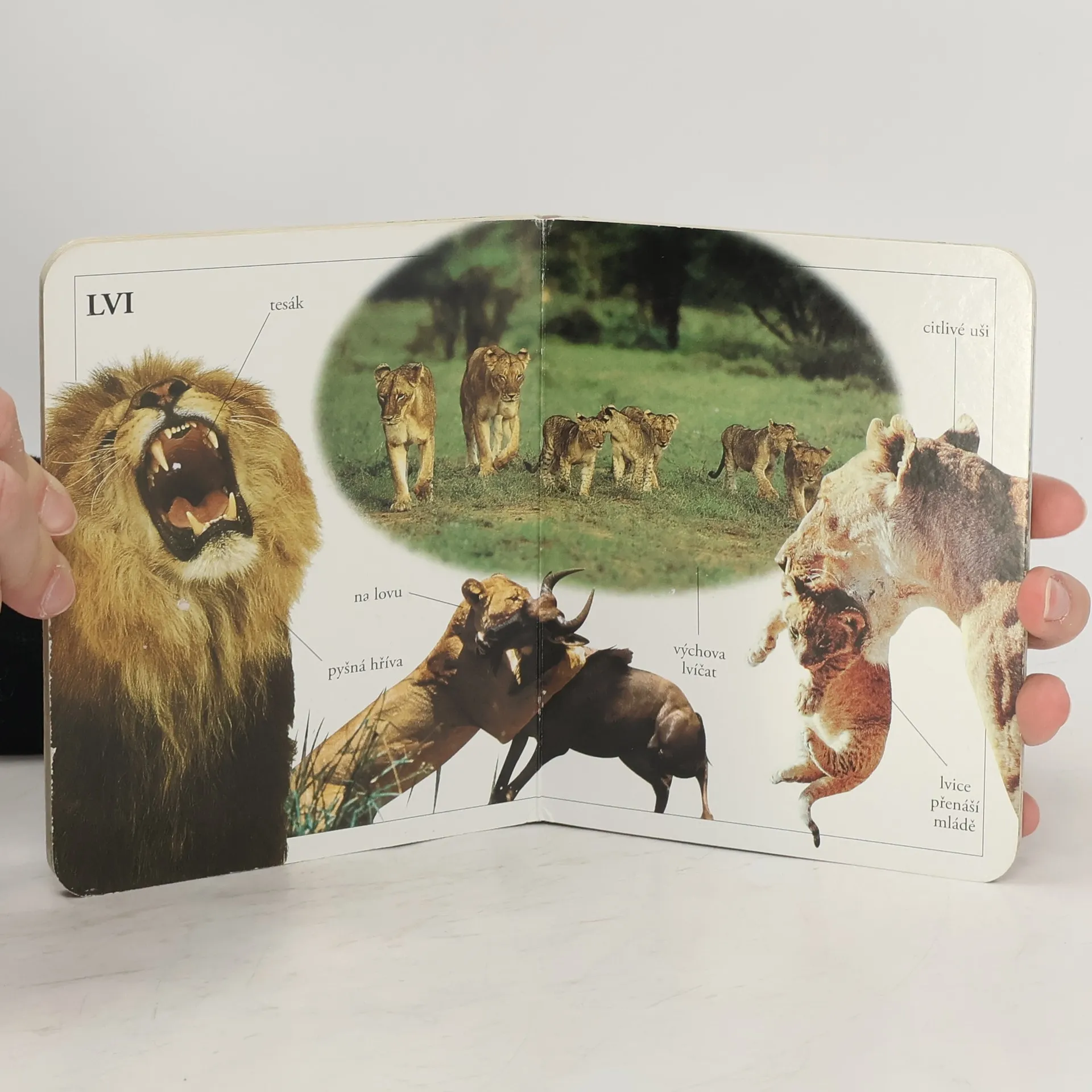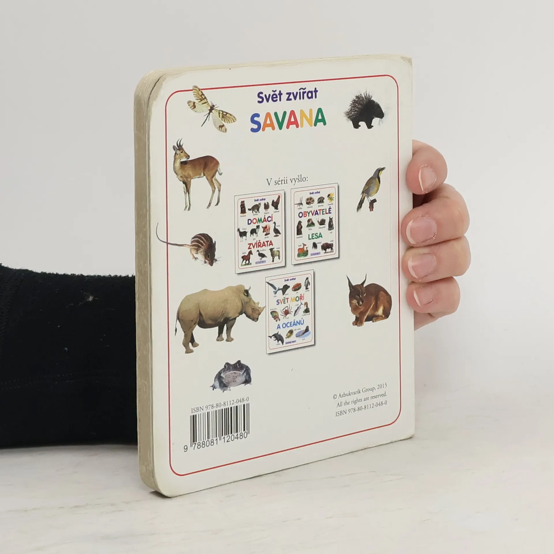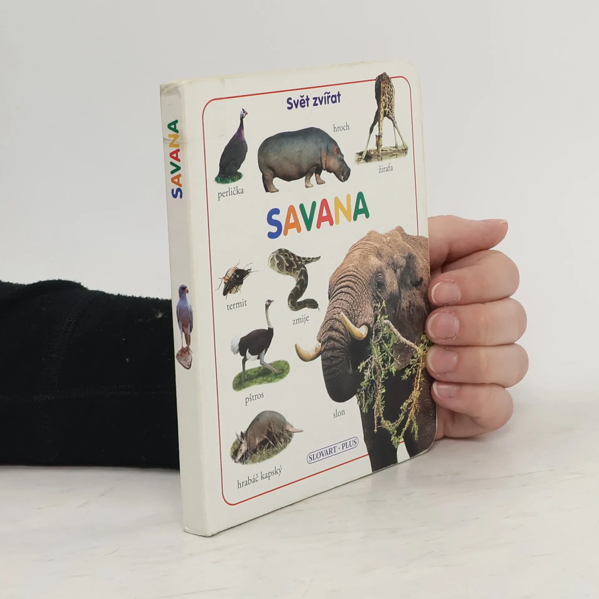 Malá knížka s tvrdými stránkami pro nejmenší čtenáře obsahuje fotografie zvířat savany a jejich popisky.