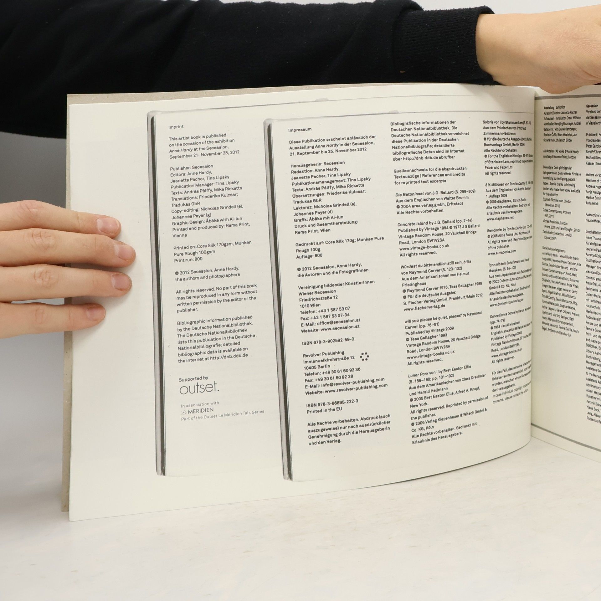 „Ich möchte Fotos machen und dadurch etwas ganz anderes schaffen als die reine Realität.“ Anne Hardy im Interview mit Elisabeth Krimbacher/Parnass Heft 3, 2012 Das vorliegende Künstlerbuch wurde von Anne Hardy konzipiert und in enger Zusammenarbeit mit dem Londoner Grafikteam abäke gestaltet. Es versammelt Auszüge aus mehreren literarischen Werken – Texte, die die Künstlerin schon lange begleiten und ihr Denken beeinflusst haben – sowie umfangreiches Bildmaterial bestehend aus Skizzen, Arbeitsproben und visuelle Quellen der Inspiration. Als vielschichtige Sammlung läßt es die LeserInnen in die Gedankenwelten Anne Hardys eintauchen und dient als eine Art Handbuch zu ihrer visuellen Sprache. Ihre Bilder sind Dokumente verschwundener Orte und zeigen oft verwirrende räumliche Situationen voll von Spuren menschlicher Präsenz und rätselhafter Aktivitäten. Obwohl druckfrisch wirkt dieses Buch wie ein Detail aus einem der Interieurs, als gehöre es einer fiktiven ProtagonistIn, die jedoch auf verstörende Weise abwesend ist. Texte: J. G. Ballard, Raymond Carver, Bret Easton Ellis, Stanislaw Lem, Tom McCarthy, Haruki Murakami, Mike Ricketts