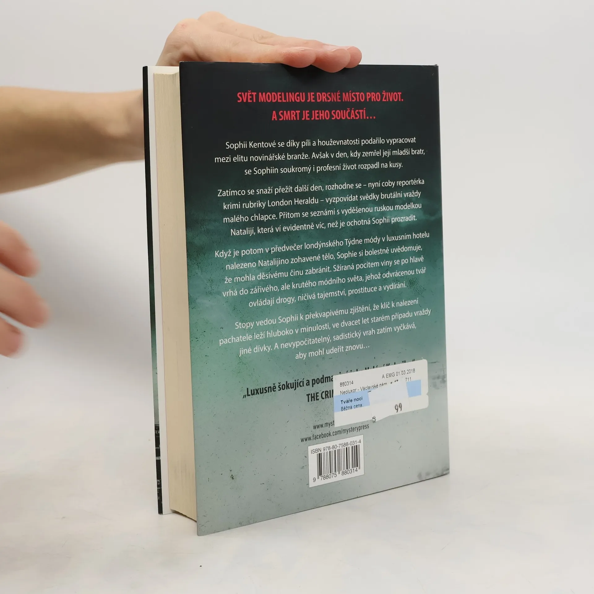 Sophii Kentové se díky píli a houževnatosti podařilo vypracovat mezi elitu novinářské branže. Avšak v den, kdy zemřel její mladší bratr, se Sophiin soukromý i profesní život rozpadl na kusy. Zatímco se snaží přežít další den, rozhodne se – nyní coby reportérka krimi rubriky London Heraldu – vyzpovídat svědky brutální vraždy malého chlapce. Přitom se seznámí s vyděšenou ruskou modelkou Natalijí, která ví evidentně víc, než je ochotná Sophii prozradit. Když je potom v předvečer londýnského Týdne módy v luxusním hotelu nalezeno Natalijino zohavené tělo, Sophie si bolestně uvědomuje, že mohla děsivému činu zabránit. Sžíraná pocitem viny se po hlavě vrhá do zářivého, ale krutého módního světa, jehož odvrácenou tvář ovládají drogy, ničivá tajemství, prostituce a vydírání. Stopy vedou Sophii k překvapivému zjištění, že klíč k nalezení pachatele leží hluboko v minulosti, ve dvacet let starém případu vraždy jiné dívky. A nevypočitatelný, sadistický vrah zatím vyčkává, aby mohl udeřit znovu…
