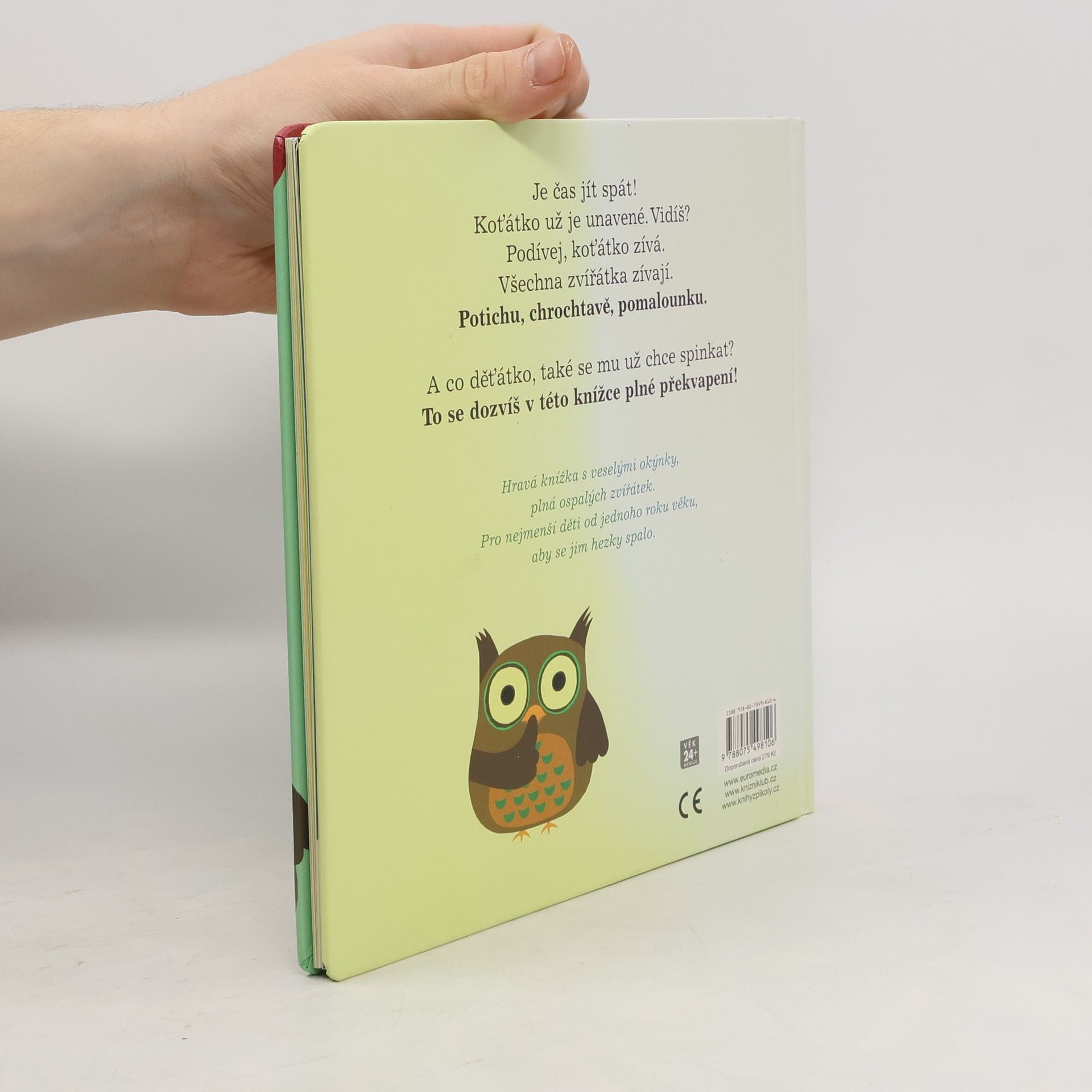 Je čas jít spát! Koťátko už je unavené. Všechna zvířátka zívají. Potichu, chrochtavě, pomalounku. A co děťátko, také se mu už chce spinkat? Veselá a hravá knížka se zívacími okýnky je plná ospalých zvířátek. Je věnována nejmenším dětem od jednoho roku věku, aby se jim hezky spalo.