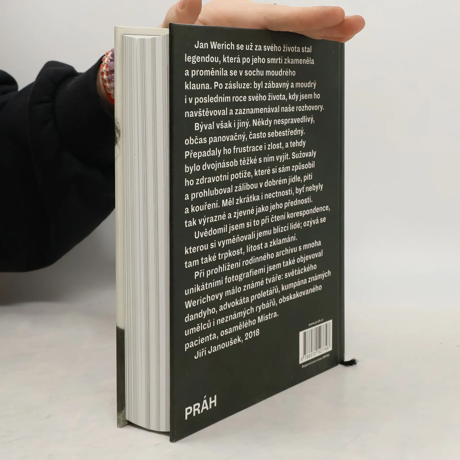 Kniha Jan Werich za oponou přináší na tři stovky unikátních fotografií z rodinného archivu. Mapují jeho život od narození až do smrti a objevují Werichovy málo známé tváře – světáckého dandyho, geniálního komika, advokáta proletářů, kumpána známých umělců i neznámých rybářů, obskakovaného pacienta i osamělého Mistra. Mluví se v ní také o Werichových nectnostem. Že někdy býval nespravedlivý, panovačný a sebestředný. Přepadaly ho frustrace i zlost, když se z populární herecké hvězdy stal nepohodlnou osobností, kterou bývalý režim odsunul do ústraní. Sužovaly ho zdravotní potíže. Nejenže si je sám způsobil, ale prohluboval je zálibou v dobrém jídle, pití a kouření. Spojení jedinečných fotografií a dvanácti obsažných rozhovorů Jiřího Janouška, v nichž se Jan Werich nedlouho před smrtí ohlížel za svým životem, doplňují dobová svědectví a komentáře lidí, kteří mu byli nablízku, zejména Jiřího Voskovce, Miroslava Horníčka a Miloše Kopeckého, ale také lékařů, kteří ho ošetřovali nebo spoluhráčů mariáše. Kniha Jan Werich za oponou přináší plastický portrét Jana Wericha a jeho soukromí, které nebylo právě šťastné a zůstávalo skryté za legendou moudrého klauna.