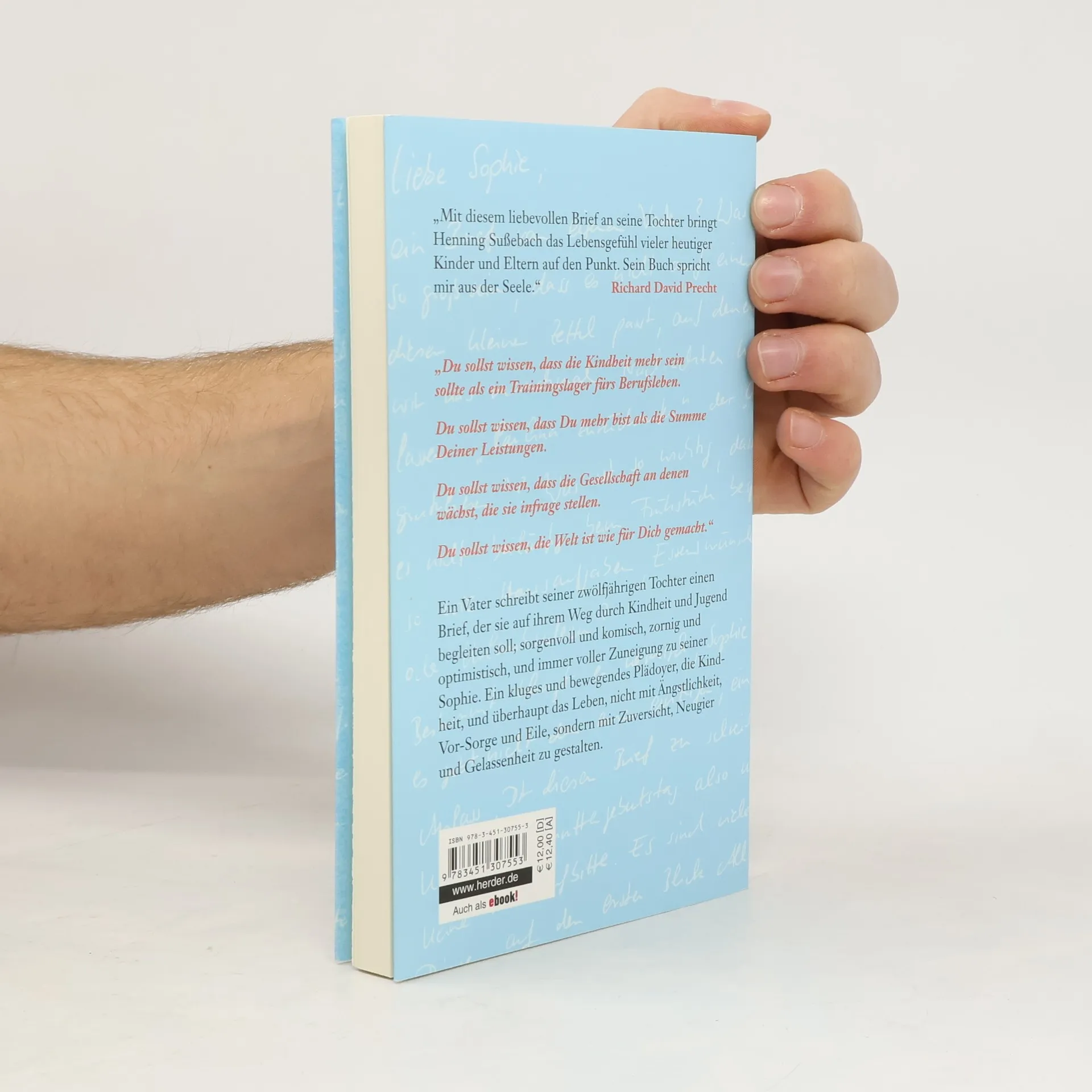 Ein Vater schreibt seiner zwölfjährigen Tochter einen Brief, der sie auf ihrem Weg durch Kindheit und Jugend begleiten soll; manchmal sorgenvoll, manchmal komisch, manchmal zornig, manchmal optimistisch, aber immer voller Zuneigung und Zutrauen zu seiner Sophie. Henning Sußebach erzählt von der zunehmenden Unterwerfung der Kindheit - auch der seiner Tochter - unter Leistungsdenken, Zeitknappheit und Konkurrenzdruck, und versucht Sophie zu erklären, warum das so ist. Vor allem aber ermutigt er sie (und mit ihr alle Kinder und Eltern), die äußerlichen Erwartungen und Zumutungen nicht fraglos zu erfüllen und ihren eigenen Weg zu gehen. Henning Sußebach bringt das Lebensgefühl der heutigen Kinder und Eltern auf den Punkt. Dem Buch zugrunde liegt ein Artikel von Henning Sußebach in der ZEIT. Ein kluges und bewegendes Plädoyer, die Kindheit, überhaupt das Leben, nicht mit Ängstlichkeit, Vor-Sorge und Eile, sondern mit Zuversicht, Neugier und Gelassenheit zu gestalten.