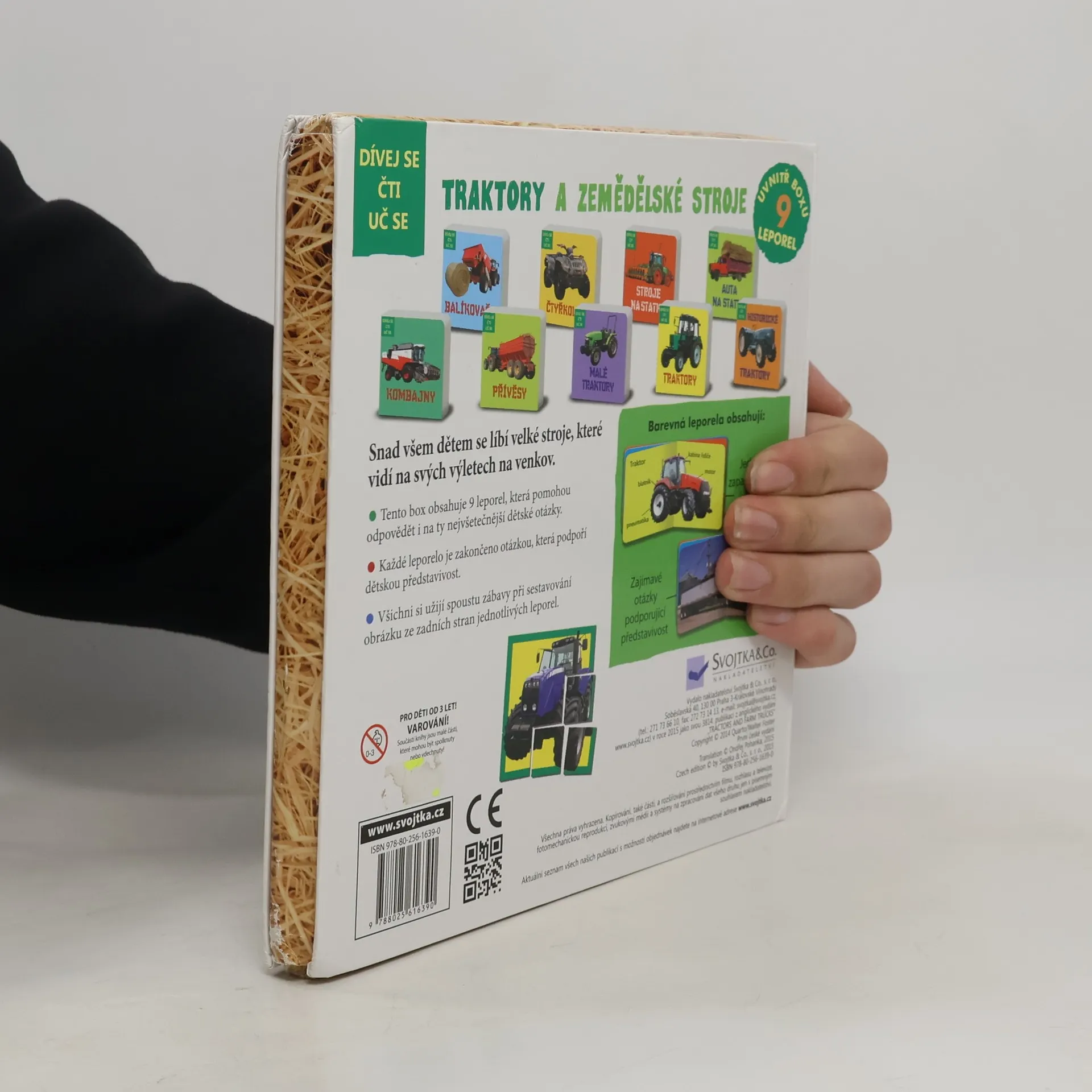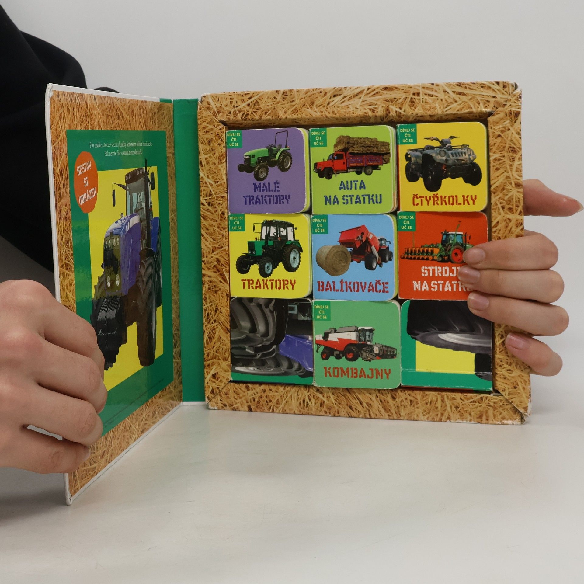 Knížka obsahující 9 leporel, kterou musí mít každý malý milovník traktorů a dalších zemědělských strojů! Prohlédněte si je společně a složte si puzzle! Chtěl by váš nejmenší řídit traktor? Chtěl by brázdit pole na kombajnu? Fascinuje ho být řidičem velkého nákladního auta, nebo naopak malé čtyřkolky? V této knížce najde každý malý milovník zemědělských strojů 9 malých leporel s mnoha nezbytnými informacemi, bez kterých se neobejde. Stačí si jen s rodiči knížečky prohlédnout a poslechnout si jednoduše podaná a srozumitelná fakta o tom, jak se jednotlivé zemědělské stroje jmenují a kde, jak a při jakých pracích se vlastně používají. Na závěr prohlížení stačí všechna leporela obrátit, a vznikne tak jednoduché puzzle. Na zadní straně každého leporela totiž najdete část obrázku. Podaří se vám podle předlohy složit mohutný traktor? Pokud ano a složíte jej správně přímo do krabičky, máte rovnou i uklizeno. Stačí jen zaklapnout víko a vrátit knížku do knihovny.