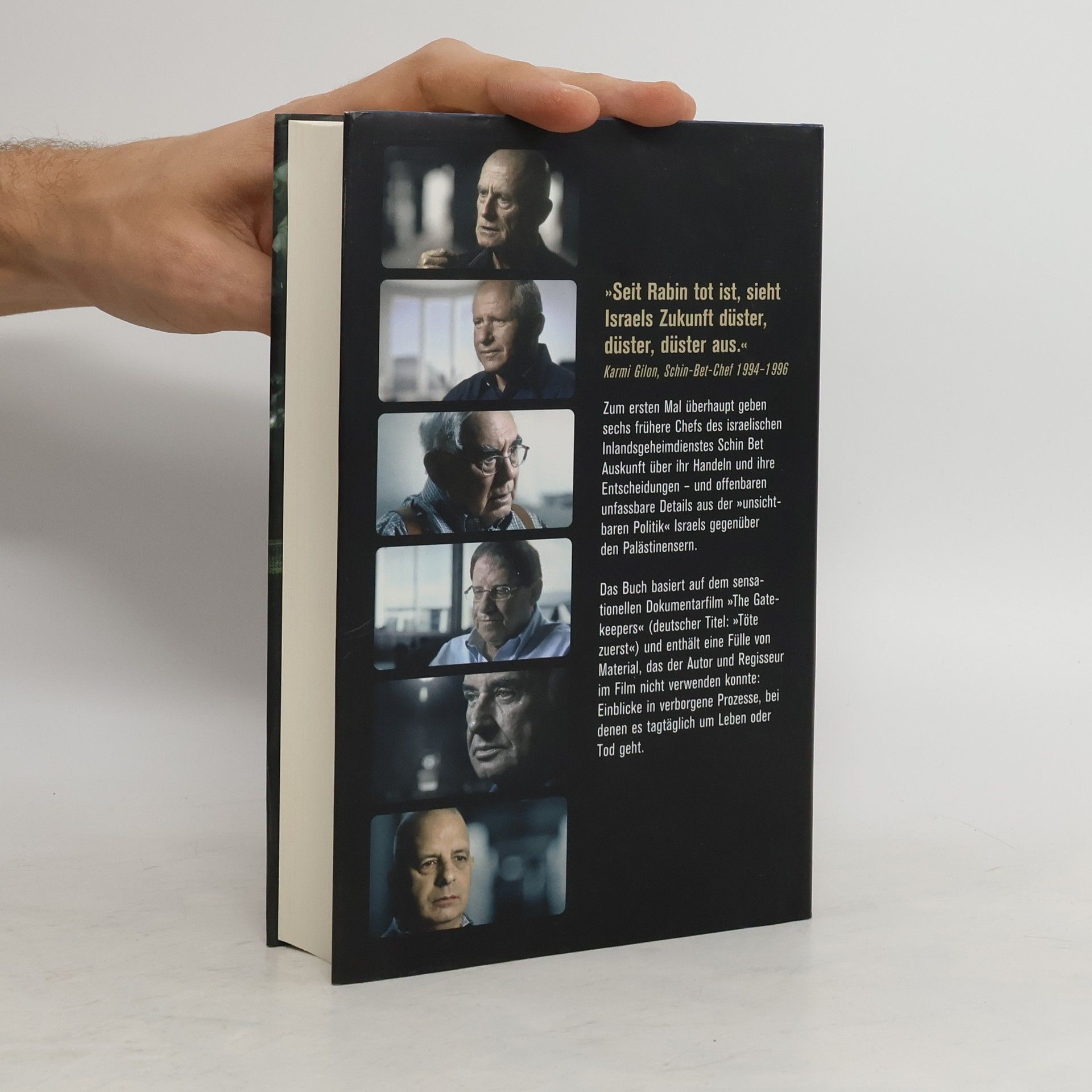 Seit dem Tod von Rabin sieht Israels Zukunft düster aus, so Carmi Gillon, ehemaliger Schin-Bet-Chef. Zum ersten Mal äußern sich sechs frühere Leiter des israelischen Geheimdienstes Schin Bet über ihre Entscheidungen und deren Auswirkungen auf die Besatzungspolitik in den palästinensischen Gebieten. Das Buch basiert auf dem Dokumentarfilm „The Gatekeepers“ und enthält zusätzliches Material, das im Film nicht verwendet wurde. Dror Moreh hat die ehemaligen Chefs vor die Kamera gebracht, wo sie offen über Folter, gezielte Tötungen und Bombenangriffe sprechen, die sie seit dem Sechstagekrieg 1967 gegen die Palästinenser angeordnet haben. Sie stellen die moralische Legitimation ihrer Handlungen in Frage und fällen ein vernichtendes Urteil. Avraham Schalom, Schin-Bet-Chef von 1980 bis 1986, vergleicht die Maßnahmen gegen die Palästinenser mit den Gräueltaten der Nazis in Osteuropa. Politisch brisant ist die Kritik der sechs Männer, allesamt israelische Patrioten, an den israelischen Regierungen seit 1967, die sie für eine falsche Palästina-Politik verantwortlich machen. Sie betonen, dass Israel zwar jeden Kampf gewinnt, aber den Krieg verliert. Der Film gilt als „spektakuläre israelische Dokumentation“ und als „der wichtigste Film des Jahres“.