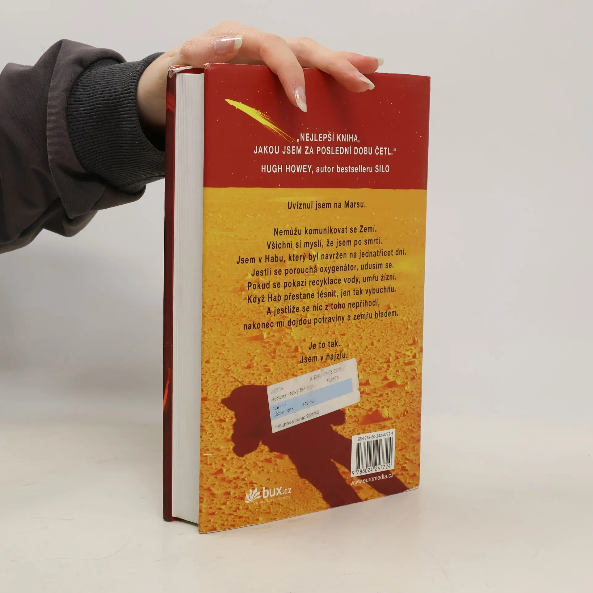 Je nejslavnějším mužem na Zemi. Má to však háček: není na Zemi… Před šesti dny se Mark Watney jako jeden z prvních lidí prošel po Marsu. Teď je přesvědčený, že bude prvním člověkem, který tam zemře. Málem zahynul v prašné bouři a zbytek jeho posádky odletěl v domnění, že je mrtvý. Mark nemá jak odeslat zprávu, že přežil. A i kdyby se s lidmi na Zemi spojit dokázal, zásoby mu dojdou mnohem dřív, než by stačila dorazit pomoc. Mark se však nevzdává. Vyzbrojen pouze svým důvtipem, technickými dovednostmi a nevyčerpatelným smyslem pro humor, který se pro něj stane nejcennějším zdrojem síly, se pouští do tvrdošíjného boje o přežití. Jak zdolává jednu zdánlivě nepřekonatelnou překážku za druhou, začíná věřit, že by na cizí planetě přece jen mohl obstát. Jenže Mars mu ještě přichystá nejedno překvapení… Strhující, podmanivý a přesvědčivý příběh o lidské nezdolnosti a vynalézavosti tváří v tvář beznadějné situaci obletěl celý čtenářský svět a ve všech zemích, kde vychází, sklízí nadšený ohlas. Zaujal i filmové tvůrce, režisér Ridley Scott točí adaptaci s Mattem Damonem v hlavní roli.