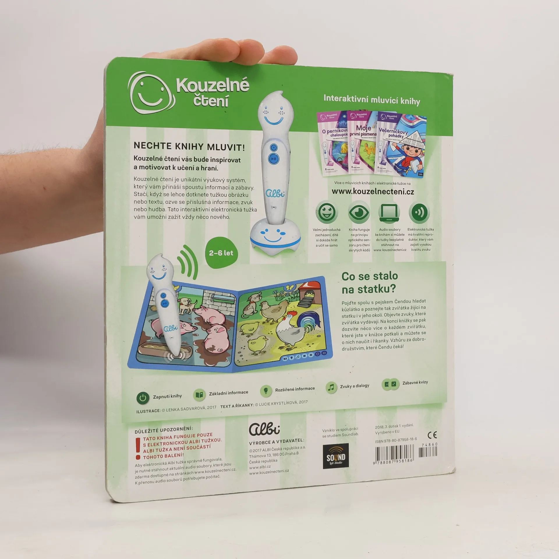 Interaktivní kniha Zvířátka na statku pozve nejmenší děti na dobrodružnou výpravu pejska Čendy za ztraceným kůzlátkem. Kniha z edice Kouzelné čtení je plná zábavných říkanek a informací o tom, co zažil malý pejsek na statku a kousek za ním. V naučné knize Zvířátka na statku objeví zvuky, které zvířátka vydávají. Na konci knížky se pak dozví více informací o každém zvířátku, které v knížce potkali a můžou se o nich naučit i říkanky. Vzhůru za dobrodružstvím, které Čendu čeká! Namluvil Jaroslav Plesl. Ilustrace Lenka Sadvarová. Text a říkanky Lucie Krystlíková. Kniha obsahuje přes 1000 zvuků a textů.
