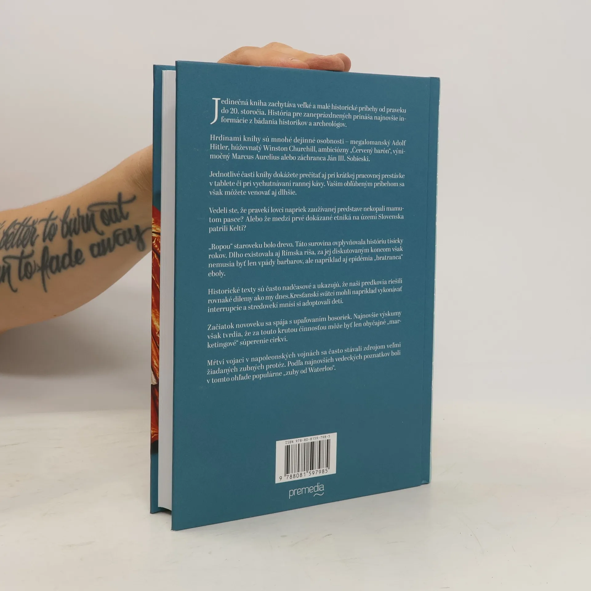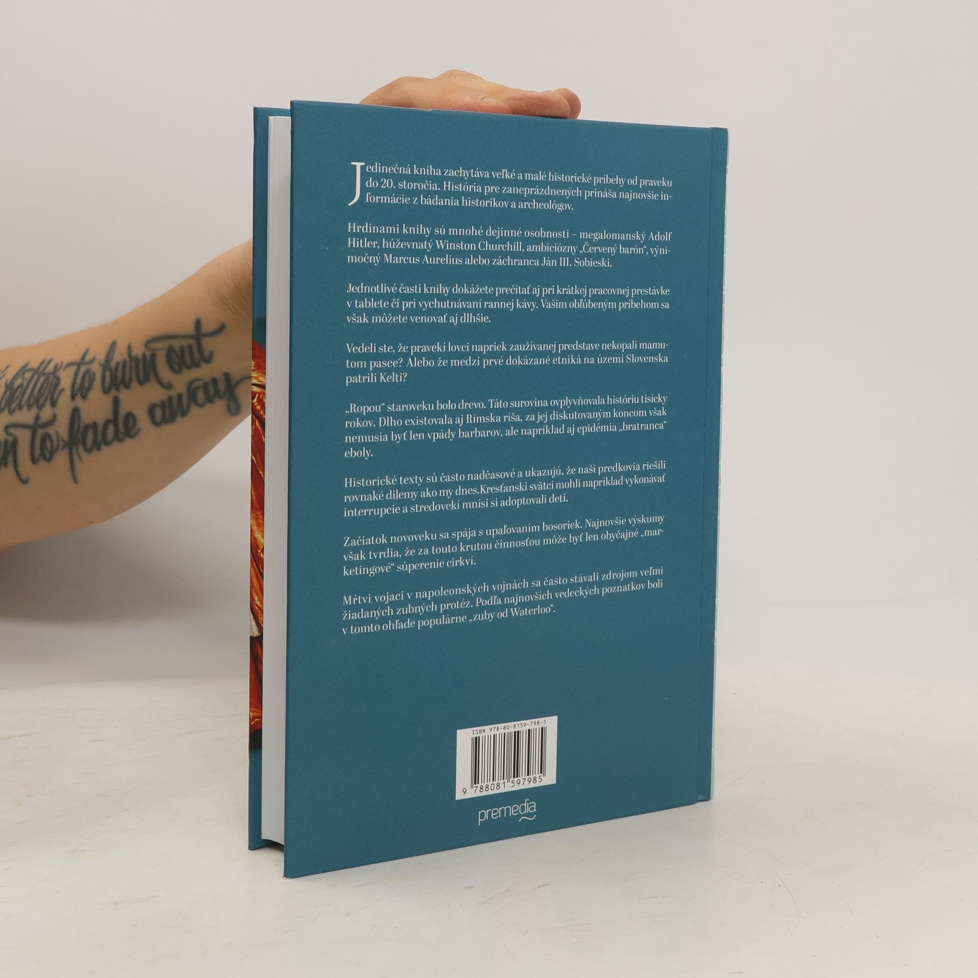 Historické texty ukazujú, že naši predkovia čelili rovnakým dilemám ako my dnes. Kresťanskí svätci mohli vykonávať interrupcie a stredovekí mnísi si adoptovali deti. Začiatok novoveku sa spája s upaľovaním bosoriek, pričom najnovšie výskumy naznačujú, že za touto krutou činnosťou môže byť „marketingové" súperenie cirkví. Kniha zachytáva významné historické príbehy od praveku po 20. storočie a prináša najnovšie informácie od historikov a archeológov. Hrdinami sú známe osobnosti ako Adolf Hitler, Winston Churchill, „Červený barón", Marcus Aurelius a Ján III. Sobieski. Jednotlivé časti sú vhodné na čítanie pri krátkej prestávke alebo pri vychutnávaní rannej kávy, pričom sa môžete venovať aj obľúbeným príbehom dlhšie. Zaujímavé fakty zahŕňajú, že pravekí lovci nekopali mamutom pasce a „ropou" staroveku bolo drevo, ktoré ovplyvnilo históriu tisícky rokov. Rímska ríša existovala dlhú dobu, a jej koniec nemusel byť spôsobený len vpádmi barbarov, ale aj epidémia „bratranca" eboly. Mŕtvi vojaci z napoleonských vojen sa stávali zdrojom žiadaných zubných protéz, pričom populárne boli „zuby od Waterloo".