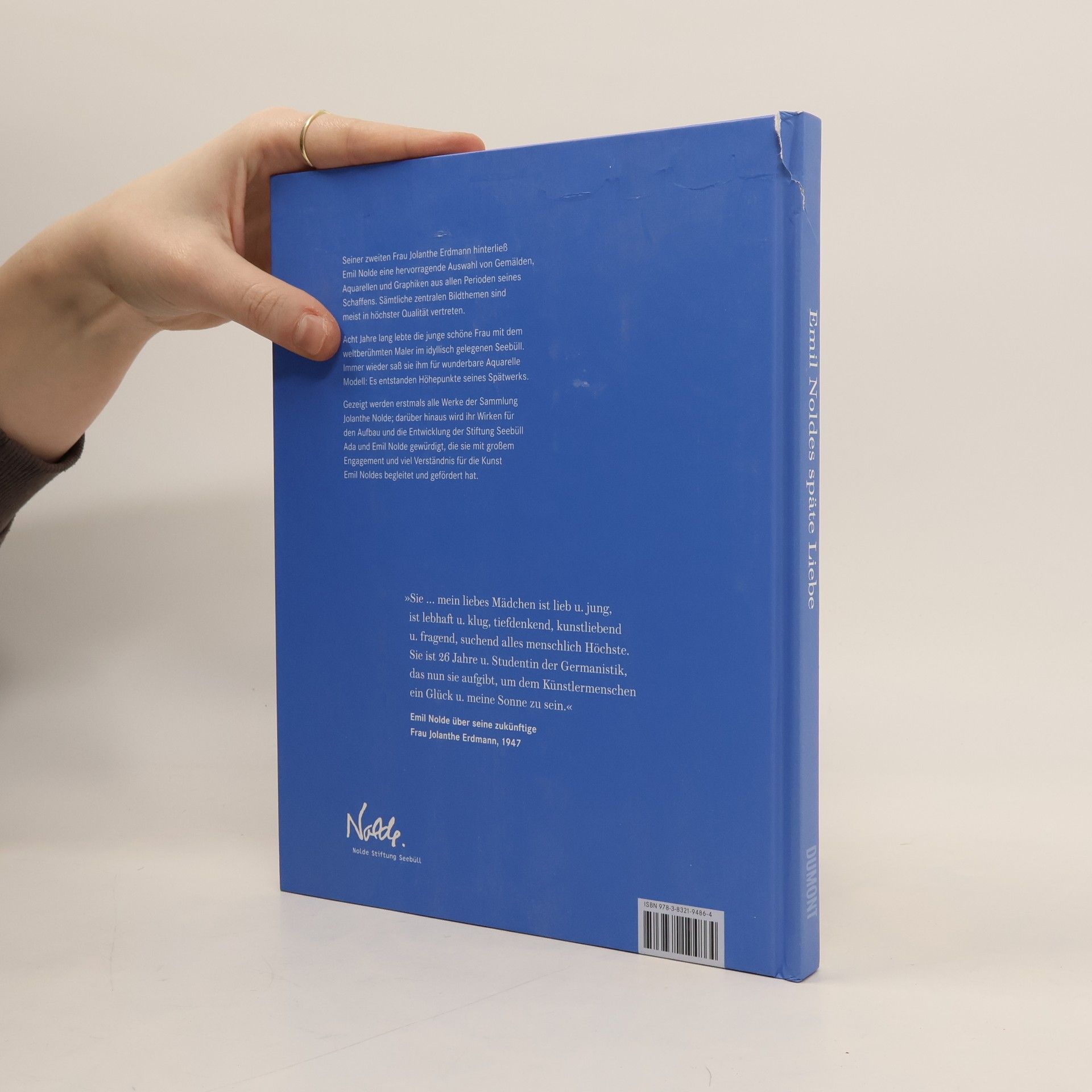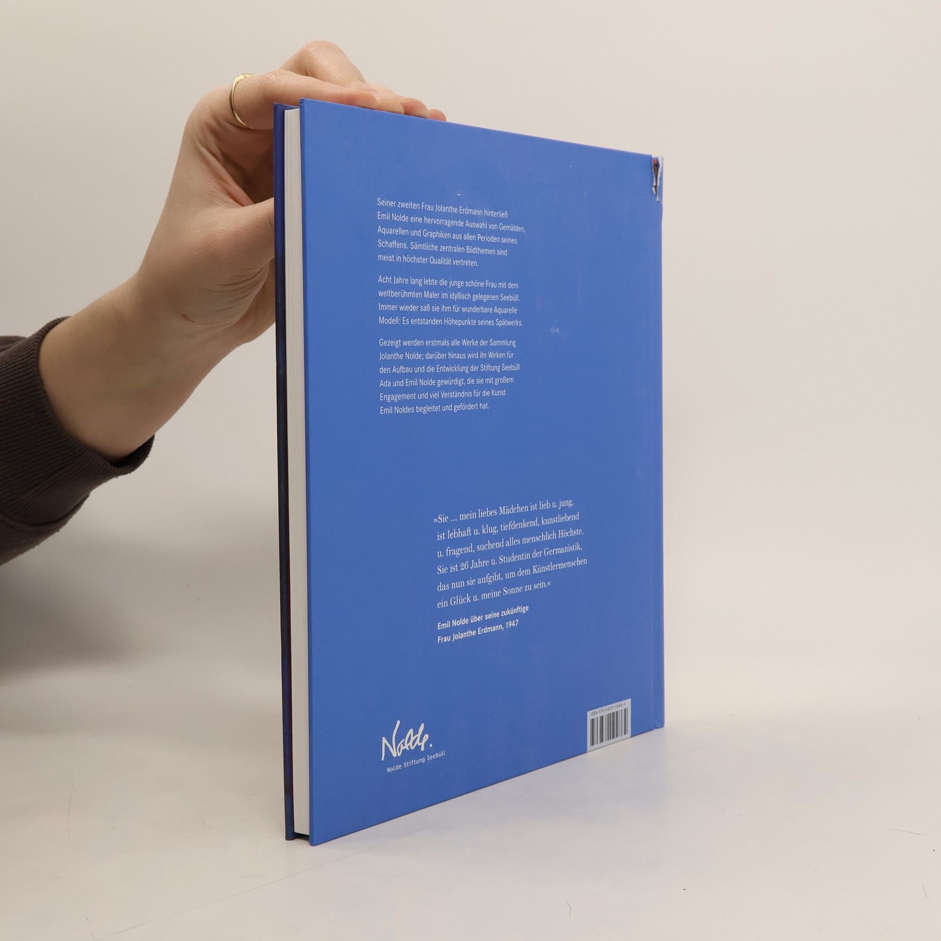Wenn von der Frau an Emil Noldes Seite gesprochen wird, ist meist Ada Nolde gemeint, mit der er 44 Jahre lang verheiratet war und die Stiftung Seebüll Ada und Emil Nolde errichtete. Aber es gab eine zweite Frau Nolde: Im Februar 1948, zwei Jahre nach Adas Tod, heiratete der 80-jährige Maler die 26-jährige Jolanthe Erdmann. Acht Jahre lang lebte sie mit ihm im abgelegenen Seebüll. Immer wieder saß sie ihm für wunderbare Aquarelle Modell: Es entstanden Höhepunkte seines Spätwerks, die die Stiftung in ihrem Bestand bewahrt. Emil Nolde hinterließ seiner jungen Frau eine eindrucksvolle Auswahl seiner Gemälde, Aquarelle und Grafiken. Die Werke stammen aus allen Perioden seines Schaffens; sämtliche zentralen Bildthemen, wie die Darstellungen von Paaren, das Thema Mutter und Kind, das Nachtleben in Berlin, die Südseereise, Blumen, Landschaften, Meere, Stillleben und freie Figurenbilder sind in höchster Qualität vertreten. Nach dem Tod Emil Noldes 1956 hat Jolanthe Nolde mit großem Verständnis und viel Liebe für sein Werk den Aufbau und die Entwicklung der Stiftung begleitet und gefördert. - Dokumentation aller Werke aus der Sammlung Jolanthe Nolde - Aquarelle von Jolanthe: Höhepunkte in Emil Noldes Spätwerk - Ein bewegtes Leben: die Biografie der zweiten Frau Nolde