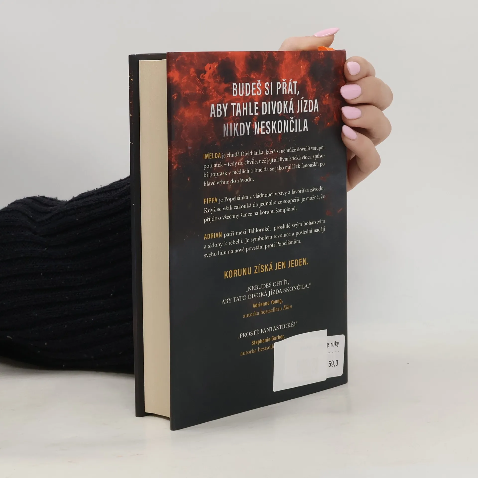 Už odedávna, kdy Popeliáni dostali od svých božstev fénixy, na nich jezdí do bitev, na lov a zejména na proslulém Dostihu. Elitní jezdci ze znepřátelených kultur touží po vítězství, a tak pilují dávné umění vytvářet a ovládat fénixy – koně, kteří se za pomoci alchymie rodí z popela. Každé ráno znovu povstávají, aby večer opět shořeli v ničivých plamenech. Dobrá alchymie ovšem není k ničemu, pokud jezdec nepřežije brutální noční souboje. Vražda je sice nezákonná, ale lámat kosti a otrávit popel je legální – publikum to dokonce vyžaduje. V letošním závodě soutěží jedenáct jezdců, ale tři z nich riskují víc než ostatní – dcera dvou bývalých šampionů, nadějná stipendistka a syn revolucionáře. Kterému z nich se podaří splnit si svůj velký sen o slávě a získat moc ve prospěch svého lidu? Anebo všichni shoří v drtivé porážce? VÍTĚZEM SE ČLOVĚK NERODÍ, VÍTĚZEM SE MUSÍ STÁT. IMELDA je chudá Dividiánka, která si nemůže dovolit vstupní poplatek – tedy do chvíle, než její alchymistická videa způsobí poprask v médiích a Imelda se jako miláček fanoušků po hlavě vrhne do závodu. PIPPA je Popeliánka z vládnoucí vrstvy a favoritka závodu. Když se však zakouká do jednoho ze soupeřů, je možné, že přijde o všechny šance na korunu šampionů. ADRIAN patří mezi Táhloruké, známé svým bohatstvím, ale také zmařenými povstáními. Je symbolem revoluce a poslední nadějí svého lidu na nové povstání proti Popeliánům. KORUNU ZÍSKÁ JEN JEDEN.