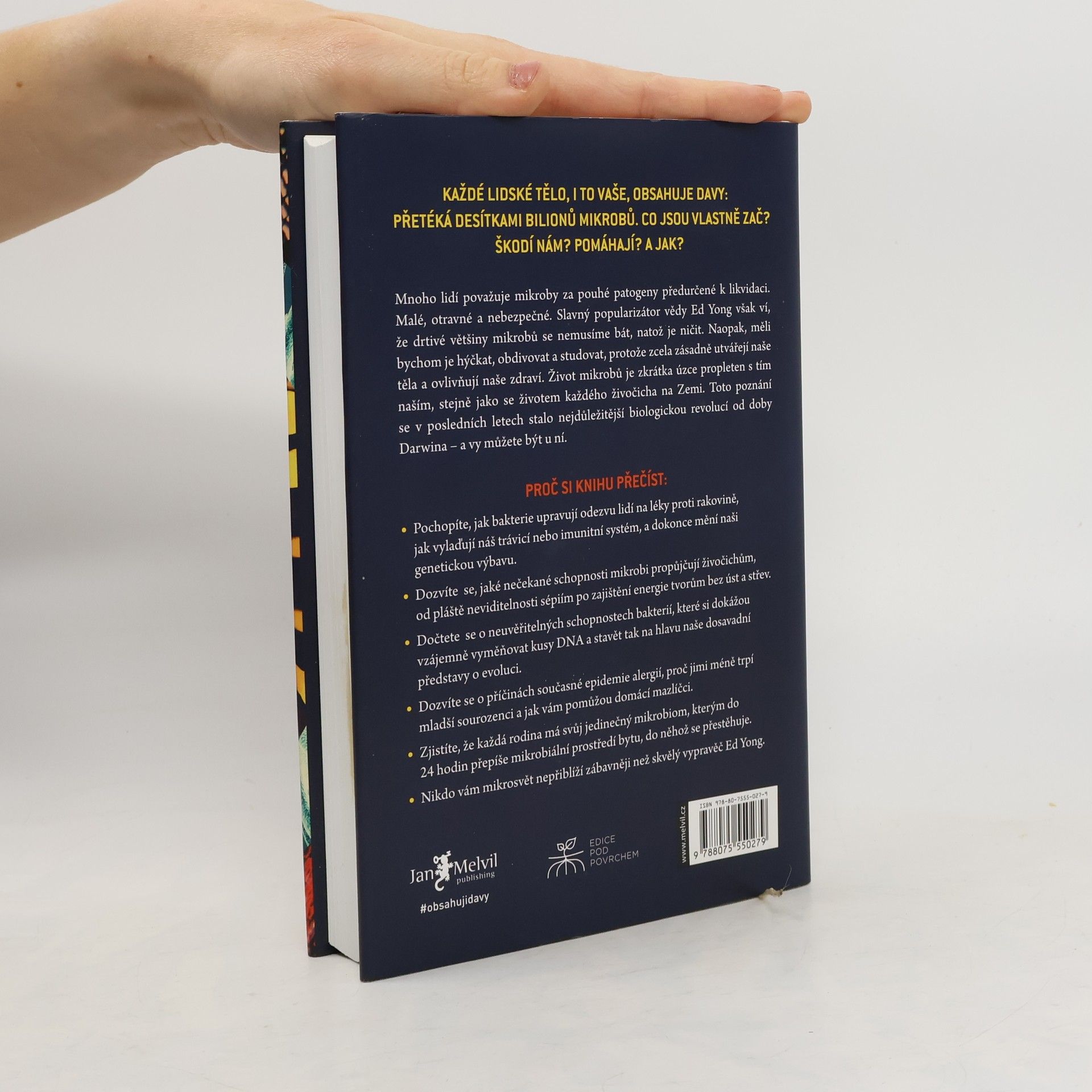 Přelomové, nádherně poučné a velmi zábavné pojednání o nejzásadnější revoluci v biologii od dob Darwina - pohled na svět „očima mikroba“, který odhaluje kouzelný a radikálně přestavěný obraz života na Zemi. Každý živočich, ať už člověk, sépie nebo vosa, je domovem milionů bakterií a dalších mikrobů. Ed Yong, jehož humor je stejně evidentní jako jeho vzdělání, nás ponouká k tomu, abychom se na sebe a své zvířecí společníky podívali v novém světle - ne jako na jedince, ale spíše jako na vzájemně propojené a závislé davy, kterými nepochybně jsme. Mikrobi v našem těle jsou součástí našeho imunitního systému a chrání nás před chorobami. V hlubokých oceánech se nacházejí záhadní tvorové bez úst a střev, kterým veškerou energii zajišťují mikrobi. Bakterie poskytují sépiím pláště neviditelnosti, pomáhají škůdcům likvidovat lesy a umožňují parazitům způsobovat nemoci postihující miliony lidí. Mnoho lidí mikroby považuje za patogeny předurčené k likvidaci, ale ti, kteří s námi žijí - mikrobiom - formují naše tělo, chrání naše zdraví, utvářejí naši identitu a zaručují nám neuvěřitelné schopnosti. V této ohromující knize vás Ed Yong zavede na velkolepou výpravu za našimi mikrobiálními partnery a představí vám vědce v předních liniích vývoje. Změní váš pohled na přírodu a zároveň i vnímání našeho místa v ní.
