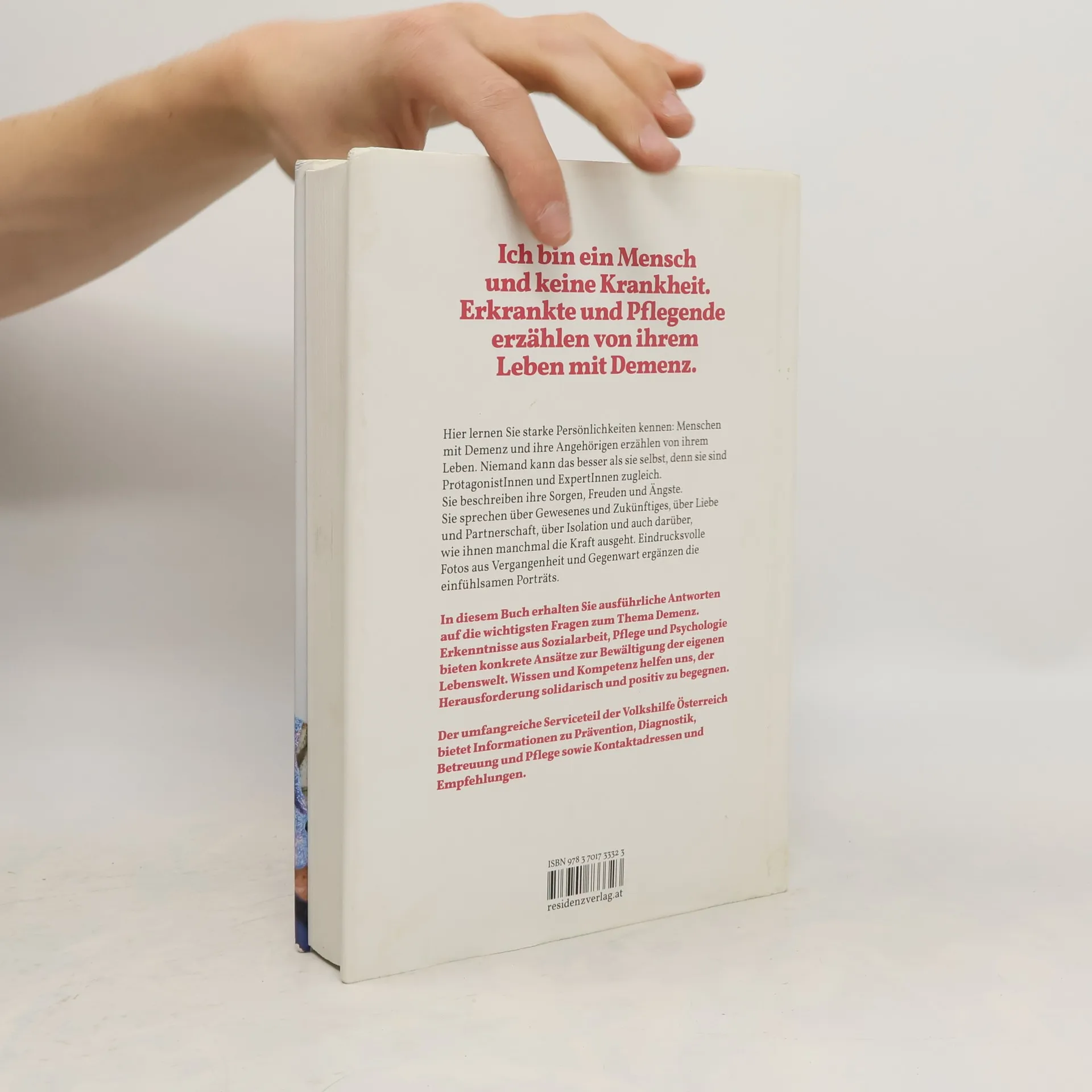 Erkrankte und Pflegende erzählen von ihrem Leben mit Demenz In diesem Buch lernen Sie starke Persönlichkeiten kennen: Menschen mit Demenz und ihre Angehörigen erzählen von ihrem Leben. Niemand kann das besser als sie selbst, denn sie sind ProtagonistInnen und ExpertInnen zugleich. Sie beschreiben ihre Sorgen, Freuden und Ängste. Sie sprechen über Gewesenes und Zukünftiges, über Liebe und Partnerschaft, über Isolation und auch darüber, wie ihnen manchmal die Kraft ausgeht. Eindrucksvolle Fotos aus Vergangenheit und Gegenwart sowie ein umfangreicher Serviceteil der Volkshilfe Österreich zu Unterstützungsangeboten, Kontaktadressen und Fakten zu Prävention, Diagnostik, Betreuung und Pflege ergänzen dieses einfühlsame Buch.