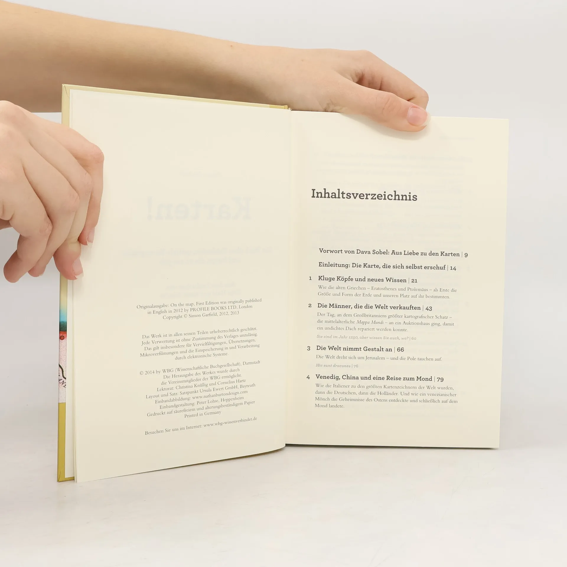 Es war einmal, da drehte sich alles um die Erde – so dachten die Menschen, bis die Astronomen sie eines Besseren belehrten. Jerusalem stand damals im Zentrum jeder Karte, oder Youzhou, wenn wir in China gelebt hätten. Und heute stehen wir im Zentrum unserer eigenen Welt. Auf unseren Navigationsgeräten planen wir nicht etwa eine Route von A nach B: Jede Entfernung misst sich von dem Punkt an, an dem wir gerade stehen. Wie konnte es nur so weit kommen? Mit einem Blick in die Geschichte gibt Simon Garfield die Antwort − anekdotenreich, persönlich und unglaublich unterhaltsam. Von den alten Griechen bis zu Google Maps erzählt das Buch die Geschichte der Kartografie. Dabei hat es immer die menschliche Seite hinter den Karten im Blick. So erfahren wir, warum Amerika nach dem Falschen benannt wurde, wie der größte kartografische Schatz Britanniens dazu verwendet wurde, ein undichtes Dach zu reparieren, oder auch weshalb Computerspiele die Zukunft der Kartografie sein könnten.