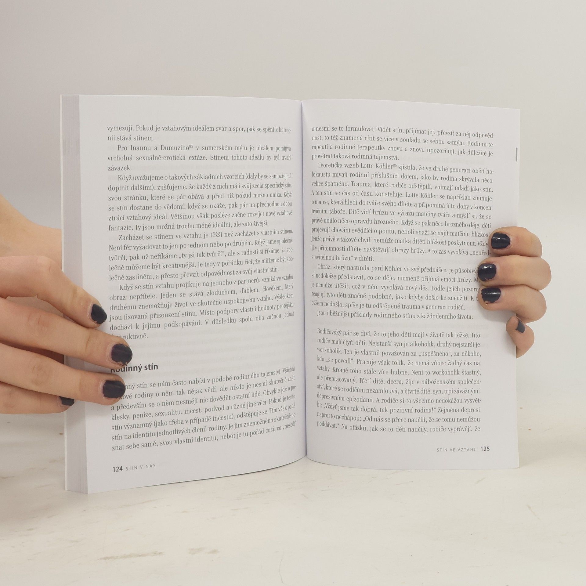 Tam, kde je světlo, je i stín. V Jungově individuaci jde o protiklad s personou – tou stránkou, kterou rádi stavíme na odiv a jejíž prostřednictvím prezentujeme svou bezúhonnost. Čím vyhraněnější persona, tím větší přetvářka a tím více potlačený stín. Stín ale nemusí znamenat vyložené zlo, nýbrž častěji prostě něco, co je méněcenné a nedokonalé. Ten, kdo si neuvědomuje vlastní stín, ho často promítá na druhé – třeba na cizince. Integrovat vlastní stín znamená překonat úzkost a paradoxně jí odebrat sílu. Znamená to přijmout vlastní životnost, stát se realističtějším a méně narcistickým. Verena Kastová existenci stínu dokládá na mýtech, pohádkách i příkladech z terapie či z každodenního života. Popisuje individuální i kolektivní stín a způsoby, jak stín přijmout. Výsledkem takového procesu je větší opravdovost, pokora i zodpovědnost za vlastní chyby.