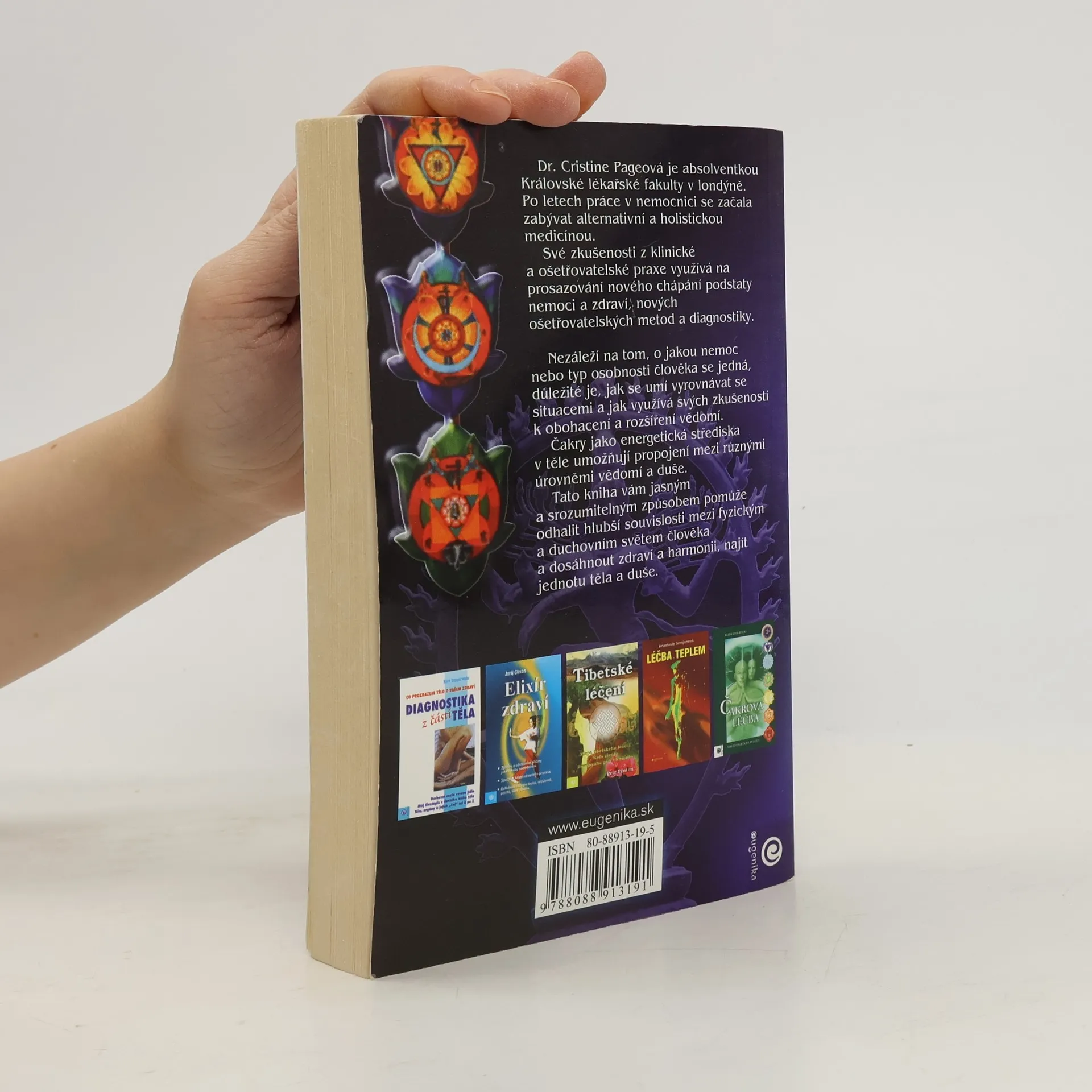 Kniha vám jasným a srozumitelným způsobem pomůže odhalit hlubší souvislosti mezi fyzickým a duchovním světem člověka a dosáhnout zdraví a harmonii, najít jednotu těla a duše. Čakry jako energetická střediska v těle umožňují propojení mezi různými úrovněmi vědomí a duše. Kniha odhaluje hlubší souvislost mezi fyzickým a duchovním světem člověka k dosažení zdraví a harmonie. Autorka je absolventkou Královské lékařské fakulty v Londýně. Po letech práce v nemocnici se začala zabývat alternativní a holistickou medicínou. Své zkušenosti z klinické a ošetřovatelské praxe využívá na prosazování nového chápání podstaty nemoci a zdraví, nových ošetřovatelských metod a diagnostiky.