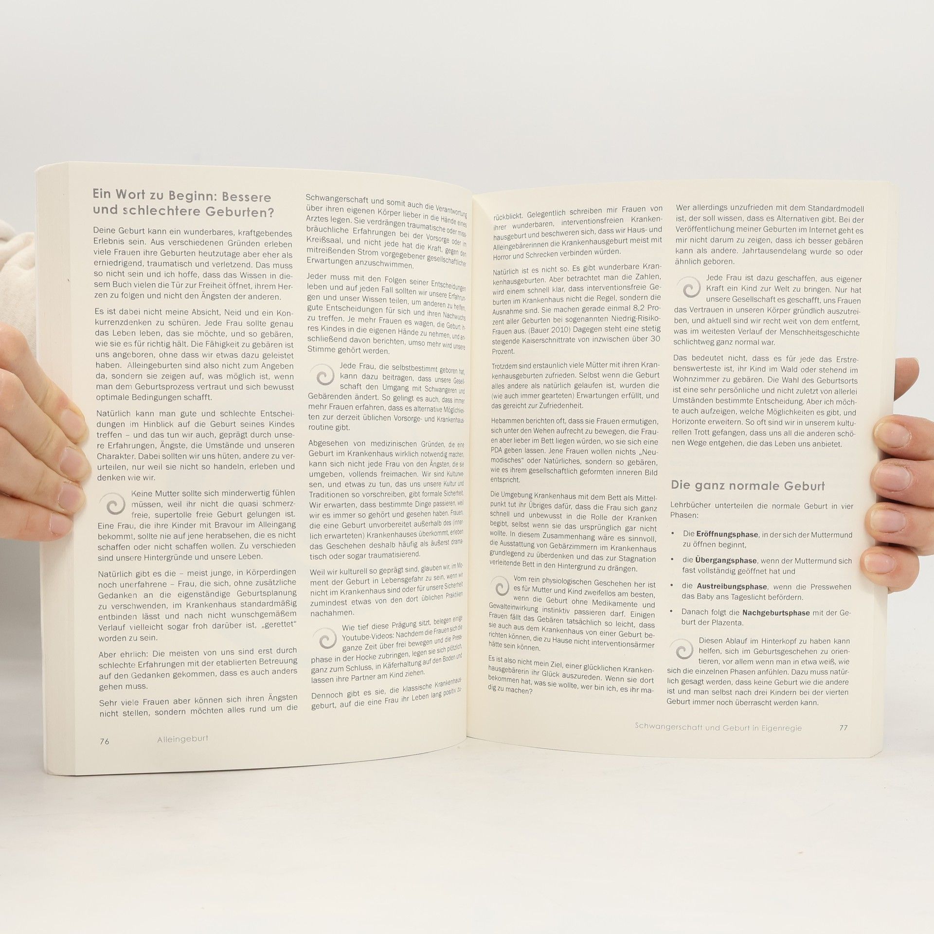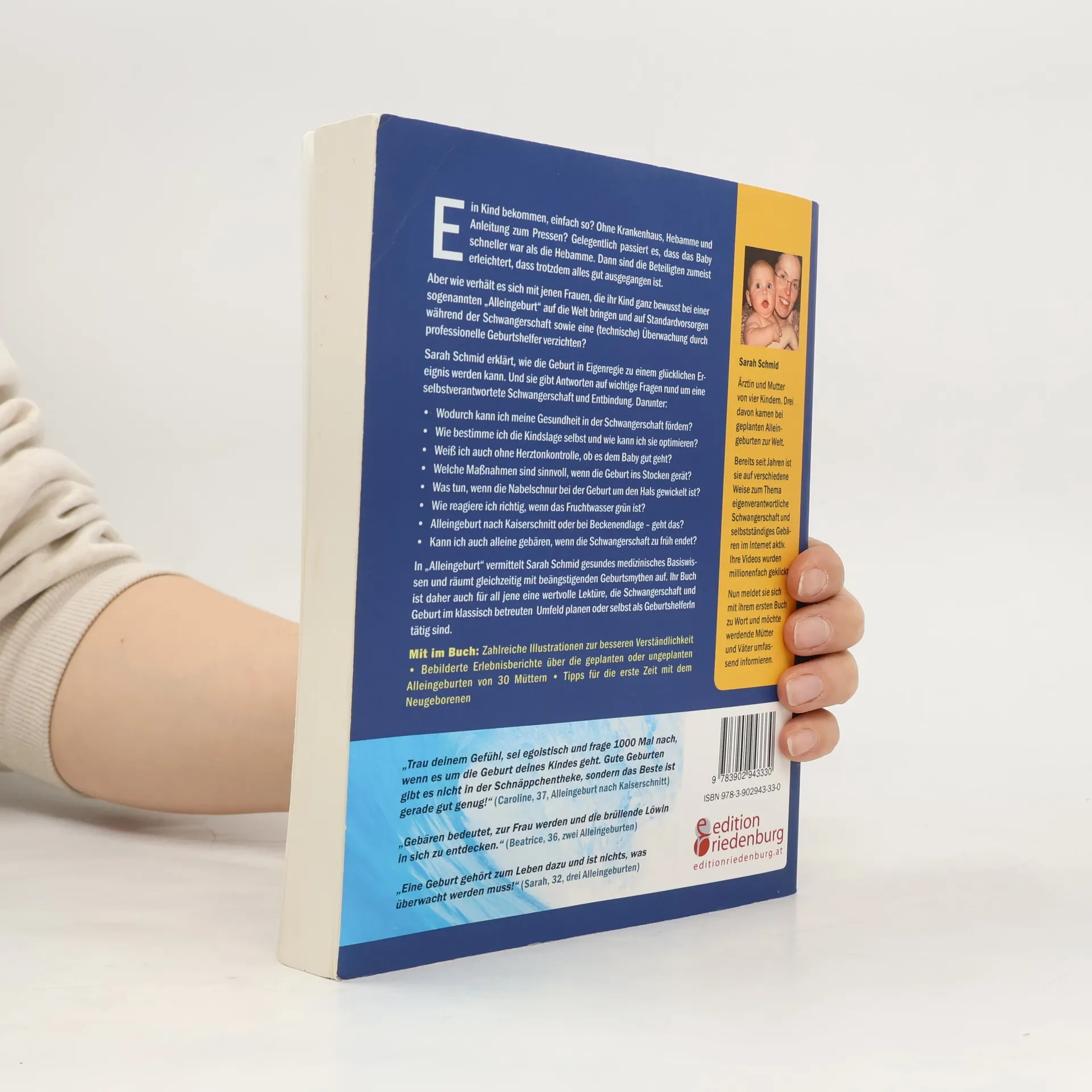 Sarah Schmid ist Ärztin, Mutter von acht Kindern und Pionierin der Alleingeburt. Sie hat kürzlich ein Zwillingspärchen eigenständig zu Hause geboren. Ihre YouTube-Geburtsvideos haben Millionen von Aufrufen, und ihr Buch ist ein unverzichtbarer Teil der Geburtsvorbereitung. Sie vermittelt verständliches medizinisches Wissen und zeigt, wie eine Geburt schmerzarm oder sogar schmerzfrei verlaufen kann. Fundierte Antworten auf zentrale Fragen zur selbstverantworteten Schwangerschaft und Entbindung nehmen werdenden Müttern Ängste und helfen ihnen, sich optimal auf die Geburt vorzubereiten, unabhängig vom Geburtsort. Wichtige Themen im Buch sind: Ernährung und Gesundheit in der Schwangerschaft, Bestimmung und Optimierung der Kindslage, Kontrolle des Babys ohne CTG und Ultraschall, Maßnahmen gegen Geburtsstillstand, verletzungsfreie Geburt nach Kaiserschnitt und selbstbestimmte Geburten bei Steißlage oder Zwillingen. Das Buch ist auch für Frauen wertvoll, die eine klassisch betreute Geburt planen, sowie für Geburtshelfer. Es enthält zahlreiche Illustrationen, bebilderte Erlebnisberichte von 30 Müttern und Tipps für die Zeit mit dem Neugeborenen. Ideal für alle, die sich gezielt Wissen zu Schwangerschaft, Geburt, Wochenbett und Stillen aneignen möchten.