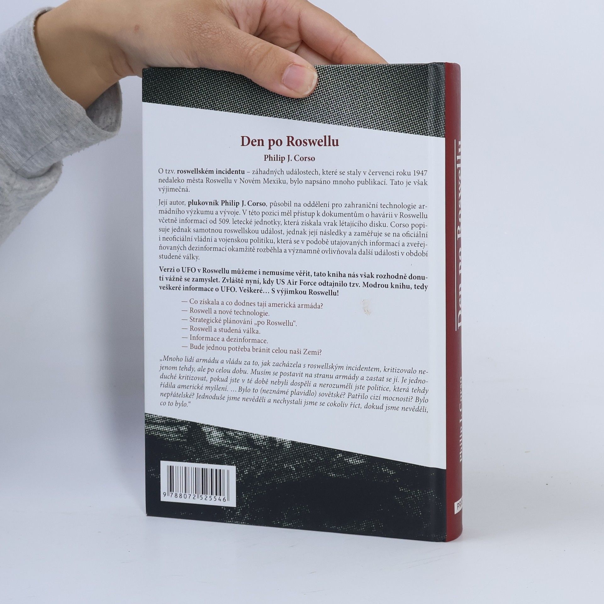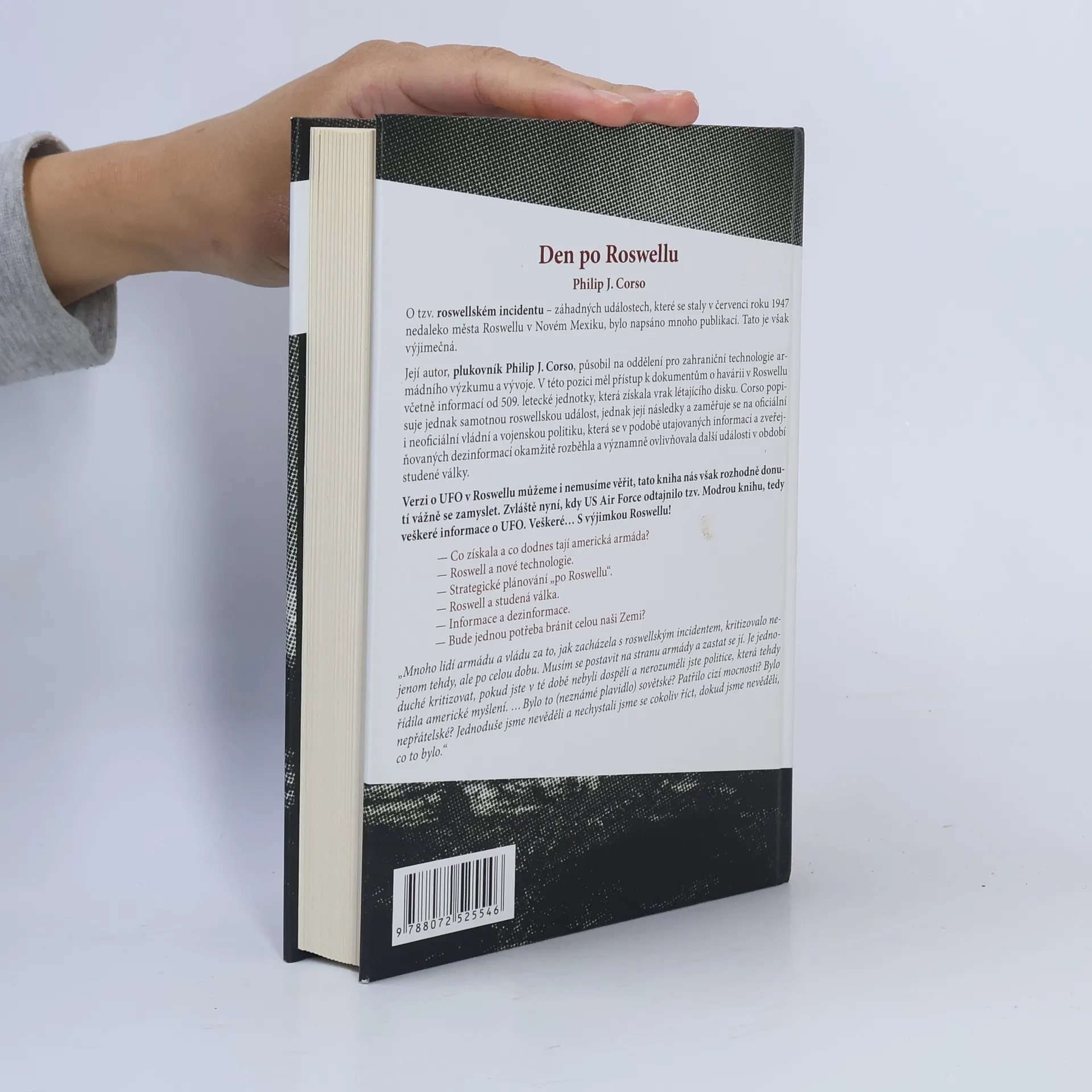 Svědectví plukovníka US Army o tzv. roswellském incidentu – záhadných událostech, které se staly v červenci roku 1947 nedaleko města Roswellu v Novém Mexiku, bylo napsáno mnoho publikací. Tato je však výjimečná. Její autor, plukovník Philip J. Corso, působil v Oddělení pro zahraniční technologie a armádního výzkumu a vývoje. V této pozici měl přístup k dokumentům o havárii v Roswellu včetně informací od 509. letecké jednotky, která získala vrak létajícího disku. Corso popisuje jednak samotnou roswellskou událost, jednak její následky a zaměřuje se na oficiální i neoficiální vládní a vojenskou politiku, která se v podobě utajovaných informací a zveřejňovaných dezinformací okamžitě rozběhla a významně ovlivňovala další události v období studené války. Verzi o UFO v Roswellu můžeme i nemusíme věřit, tato kniha nás však rozhodně donutí se vážně zamyslet. Zvláště nyní, kdy US Air Force odtajnilo tzv. Modrou knihu, tedy veškeré informace o UFO. Veškeré... S výjimkou Roswellu! – Co získala a co dodnes tají americká armáda? – Roswell a nové technologie. – Strategické plánování „po Roswellu“. – Roswell a studená válka. – Informace a desinformace. – Bude jednou potřeba bránit celou naši Zemi?