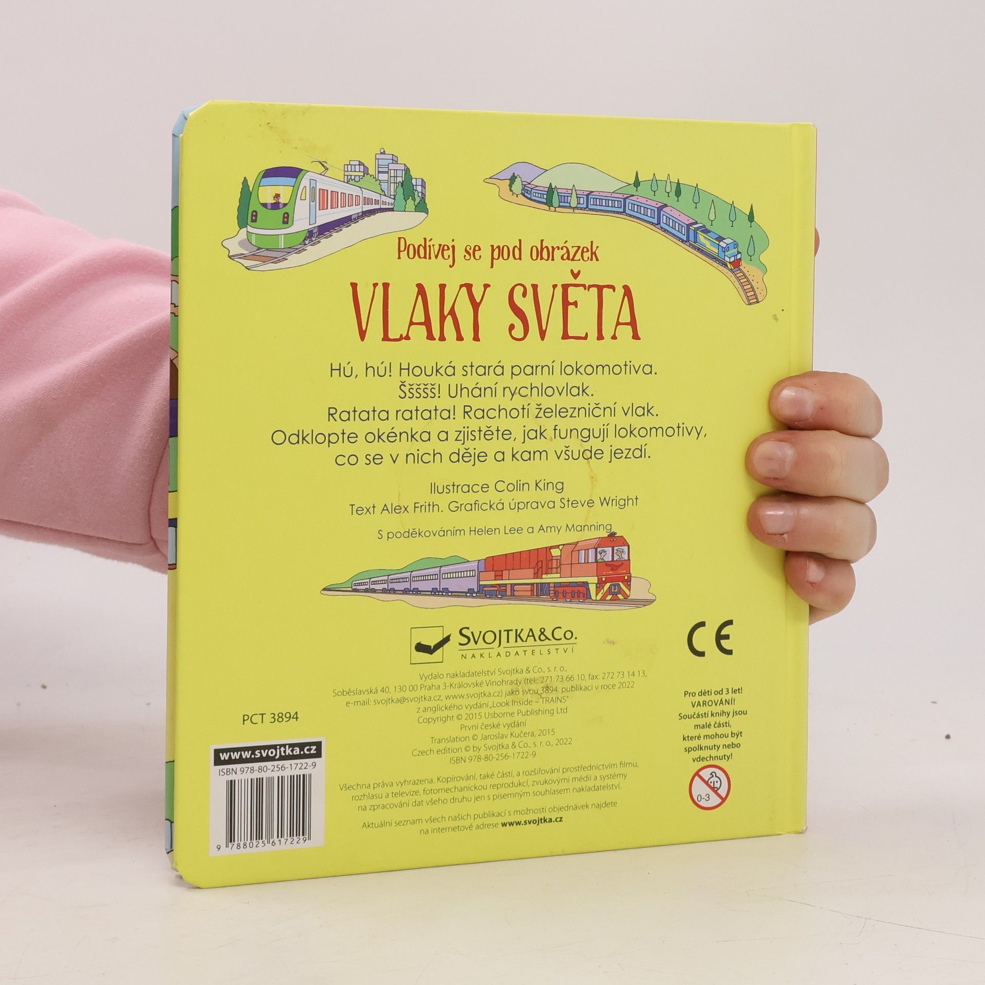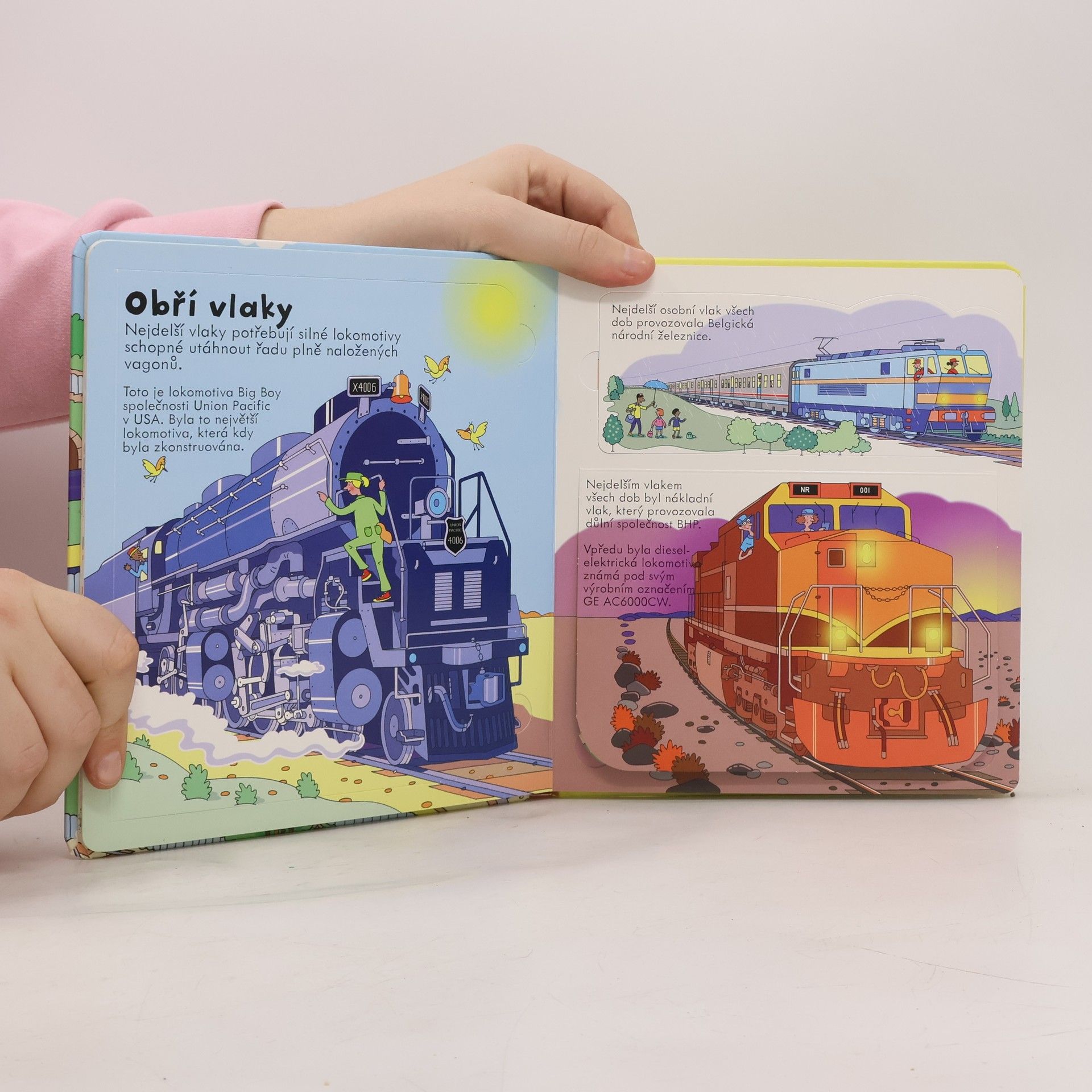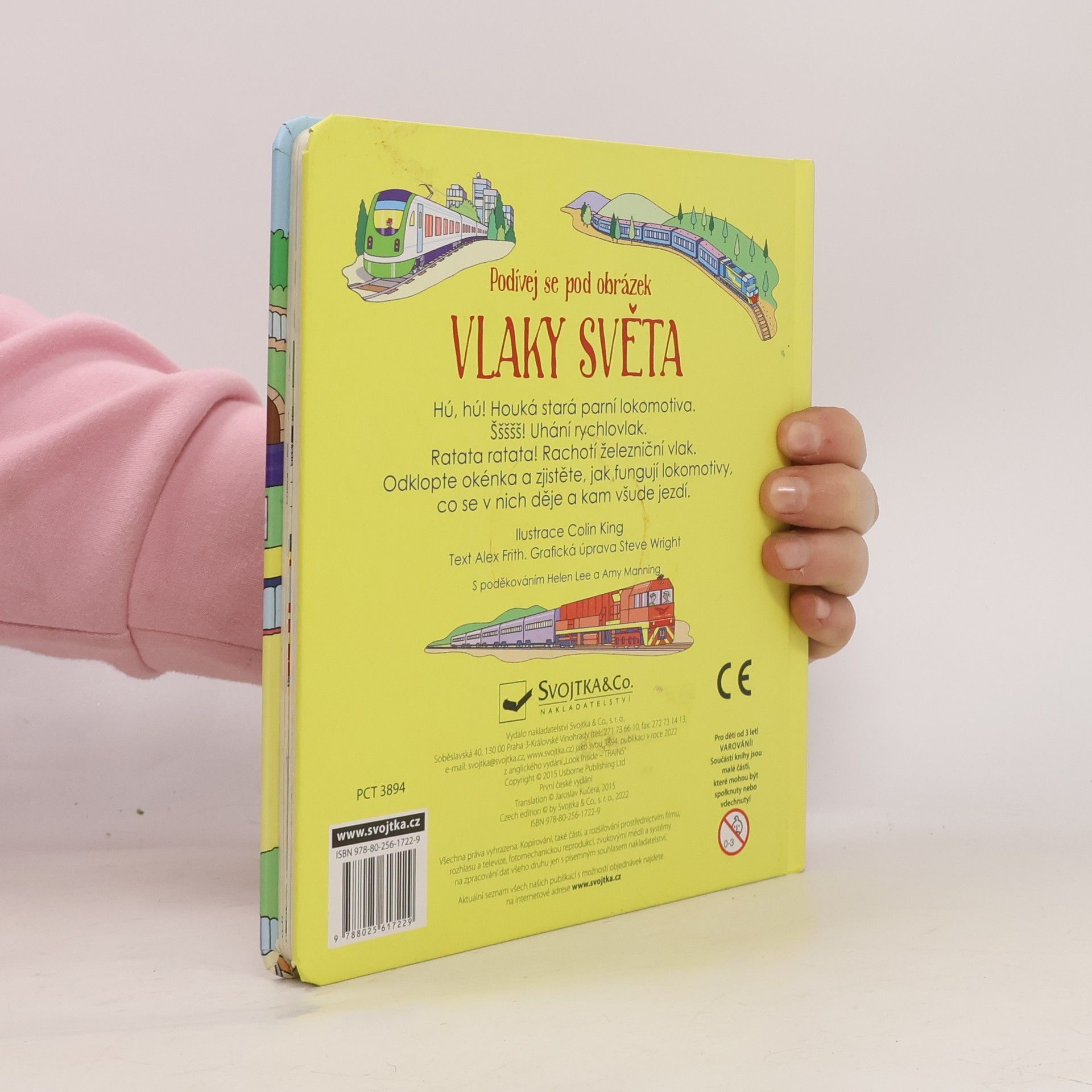 Seznam se díky této encyklopedické knížce, mající více než 60 odklápěcích okének, s různými typy vlaků. Prozkoumej je a zjisti něco nového! Seznam se díky této encyklopedické knížce, mající více než 60 odklápěcích okének, s různými typy vlaků – vlaků, které za slunečného dne, za deště či ve sněhu rachotí po kolejích a převážejí cestující a náklady zboží do všech koutů světa. Odklop tedy okénka a dozvíš se něco o historii vlaků, zjistíš nové informace o parních vlacích, o tom, jak lokomotivy pracují, o těch největších i o těch nejrychlejších, o vlacích v podzemí nebo těch, které zdolávají kopce. Tak honem nastupovat, jedeme!