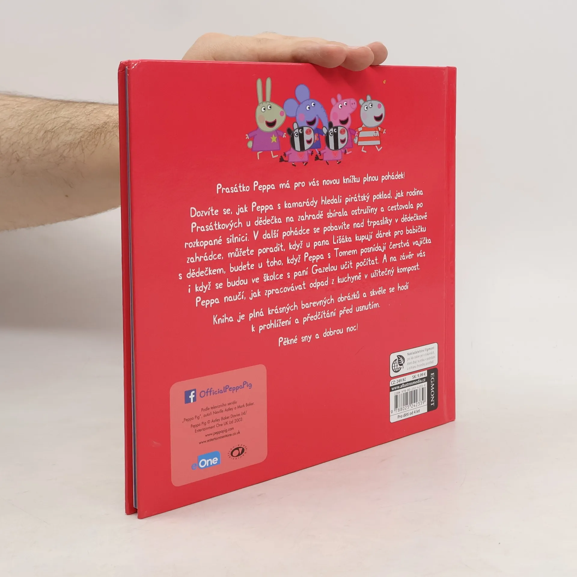 V nové knížce plné pohádek si přečtete, jak Peppa s kamarády hledala pirátský poklad nebo se ve školce učila počítat, o tom, jak s rodinou sbírali ostružiny, nakupovali u pana Lišáka, cestovali po rozkopané silnici, stavěli studnu přání, sbírali čerstvá vajíčka a vyráběli kompost. Knížka s krásnými obrázky se skvěle hodí k předčítání přes usnutím!