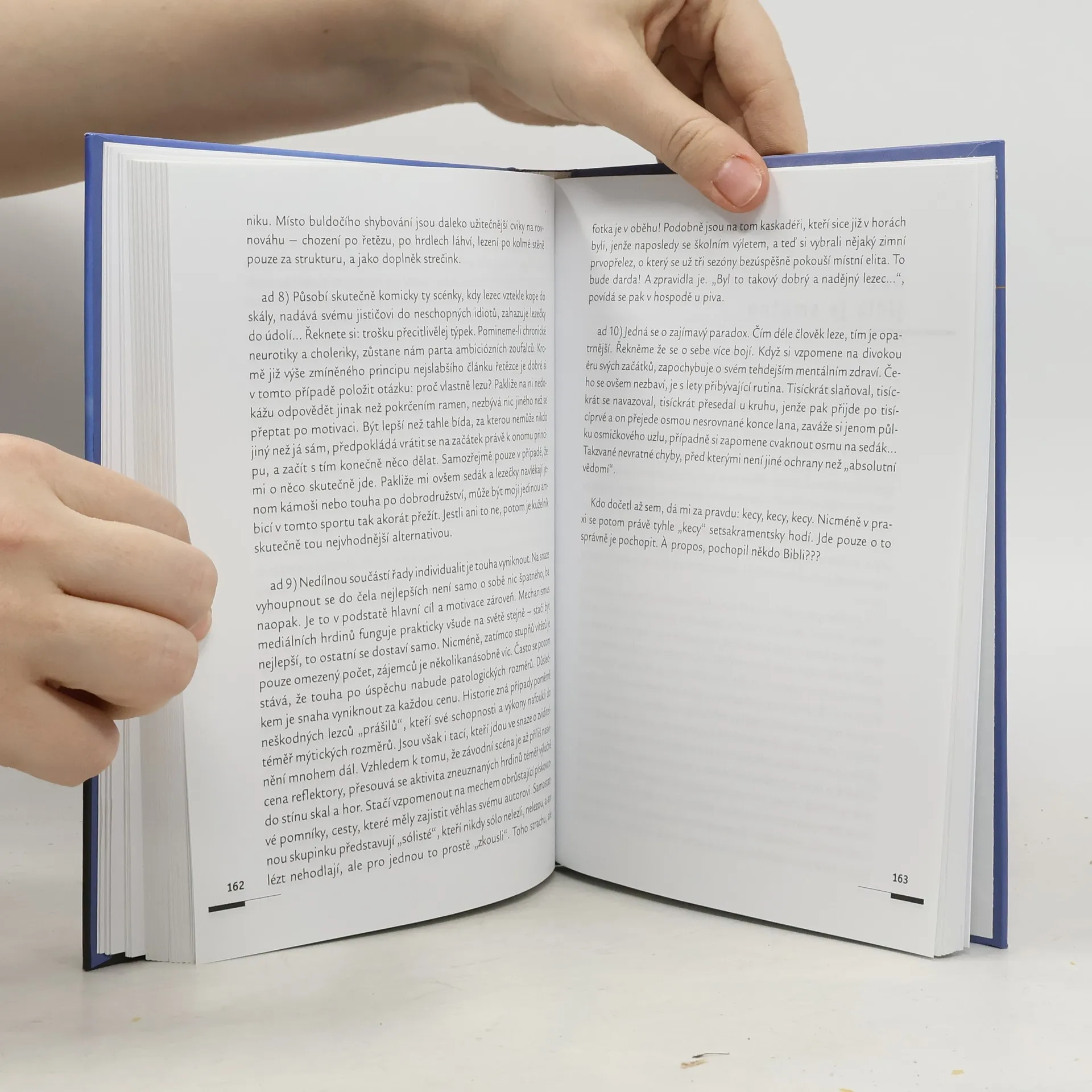 "Lezení pro mě nikdy nebylo, není a nebude jen ve smyslu nahoru a dolů. To, čemu říkám horolezectví nebo lezení, je o pocitech. Takže kdo chce hodnotit výkon, nemusí číst dál." A o tom je vlastně celá jeho kniha. Totiž o radosti ze života za všech okolností.