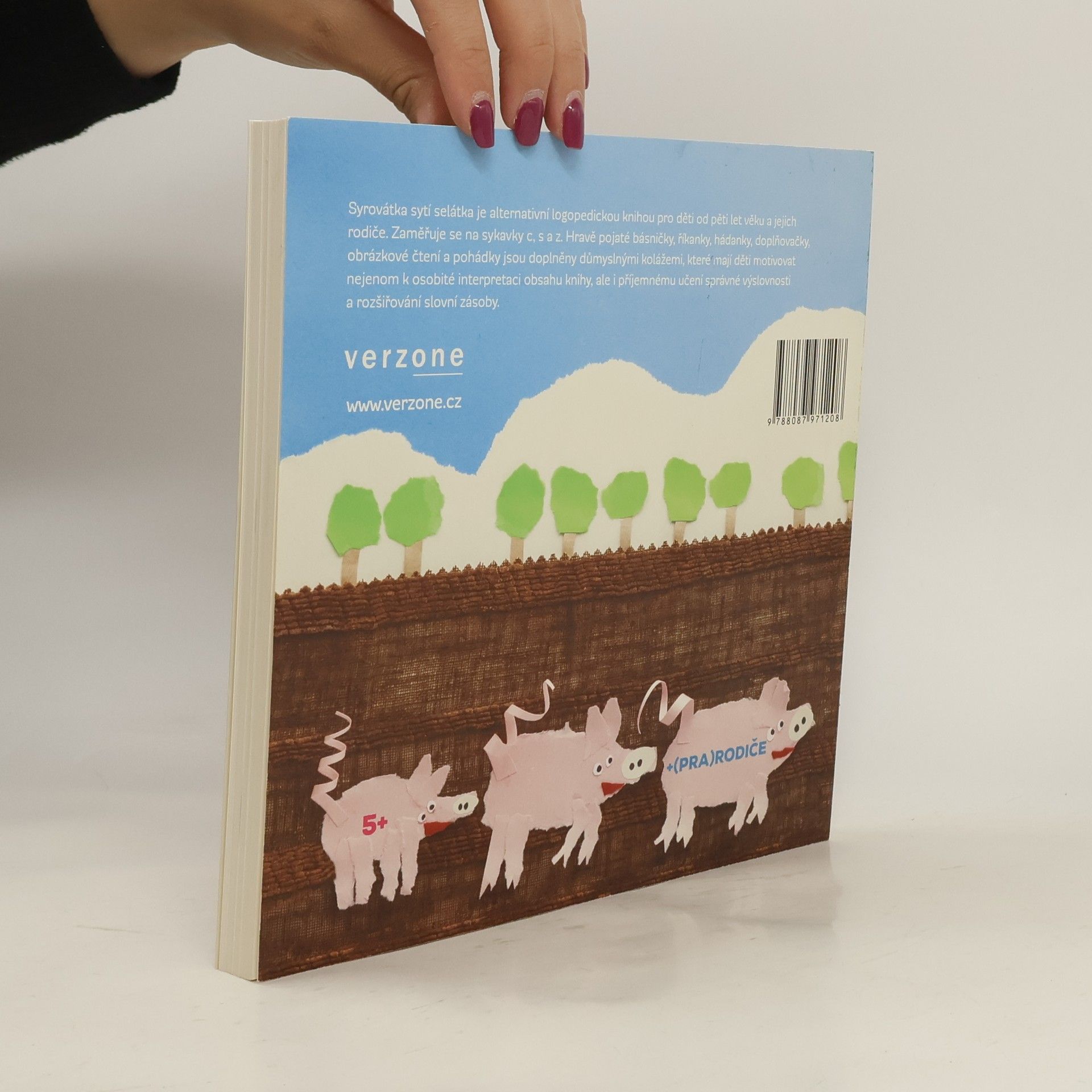 Syrovátka sytí selátka je alternativní logopedickou cvičebnicí se zaměřením na sykavky C, S a Z. Hravě pojaté básničky, říkanky, hádanky, doplňovačky, obrázkové čtení a pohádky jsou doplněny důmyslnými kolážemi, které mají děti motivovat nejen k osobité interpretaci obsahu knihy, ale i k učení správné výslovnosti a rozšiřování slovní zásoby. Knížka je strukturována do kapitol, které zohledňují rozmanité postavení hlásek v rámci slova nebo sousloví. Ke každému textu jsou přiřazeny barevné značky odkazující k tomuto postavení. Děti tak mohou procvičovat vždy konkrétní pozici hlásky, případně jejich kombinace. Metodologicky kniha vychází ze systematického Přehledu české výslovnosti. Publikaci odborně zaštiťuje klinická logopedka Milena Šafránková. Kniha je určena všem šikovným dětem, chápavým rodičům a laskavým prarodičům, které baví trávit čas společně, aktivně a důvtipně. Autorka textu Barbora Baronová zvolila metodu volnějšího verše, který umožňuje každé drobné dílo více významově otevřít, a tím umožnit dětem vlastní – unikátní – interpretaci. K té jim dopomáhají originální koláže Jany Jandáčkové, které velmi konkrétně, a přitom hravě vysvětlují obsah textu. Knížka obsahuje i slovníček méně frekventovaných výrazů. Pro děti od 5 let a jejich (pra)rodiče