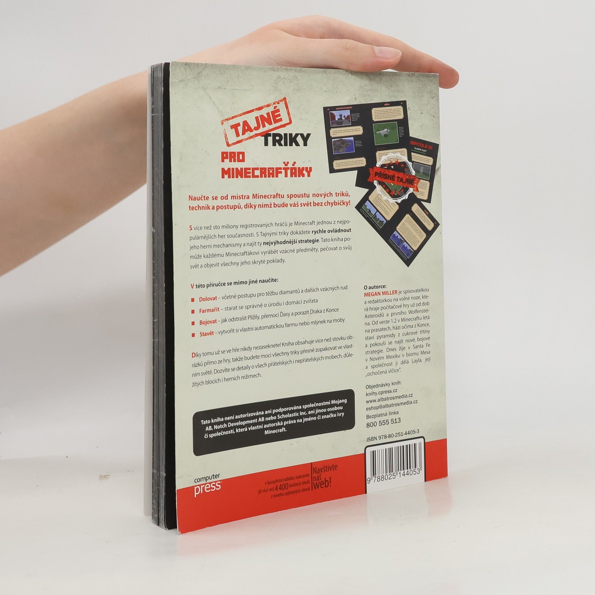 Objevte neoficiální tipy a triky, které vám pomohou ovládnout Minecraft jako mistr. S více než sto miliony registrovaných hráčů je tato hra jednou z nejpopulárnějších současnosti. Naučte se efektivně využívat herní mechanismy a strategie, které vám umožní vyrábět vzácné předměty, pečovat o svůj svět a odhalit skryté poklady. V této příručce se dozvíte, jak dolovat diamanty a další vzácné rudy, správně farmařit a pečovat o domácí zvířata, efektivně bojovat proti Plížilům, Ďasům a Drakovi z Konce, a jak stavět automatické farmy či mlýnky na moby. Díky těmto znalostem se ve hře už nikdy nezaseknete! Kniha obsahuje více než stovku obrázků přímo ze hry, což vám umožní přesně zopakovat všechny triky ve vlastním světě. Získáte také informace o přátelských i nepřátelských mobech, důležitých blocích a herních režimech. Tato příručka není autorizována ani podporována společnostmi Mojang AB, Notch Development AB nebo Scholastic Inc. O autorce: MEGAN MILLER je spisovatelka a redaktorka, která hraje počítačové hry od dob Asteroidů. Dnes žije v Santa Fe v Novém Mexiku, kde se věnuje Minecraftu a objevování nových strategií.