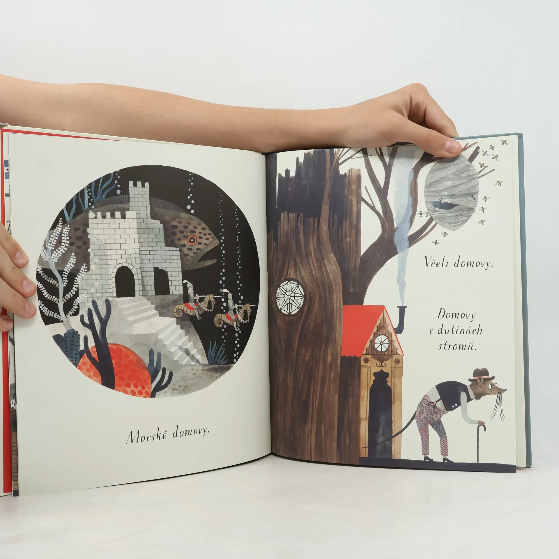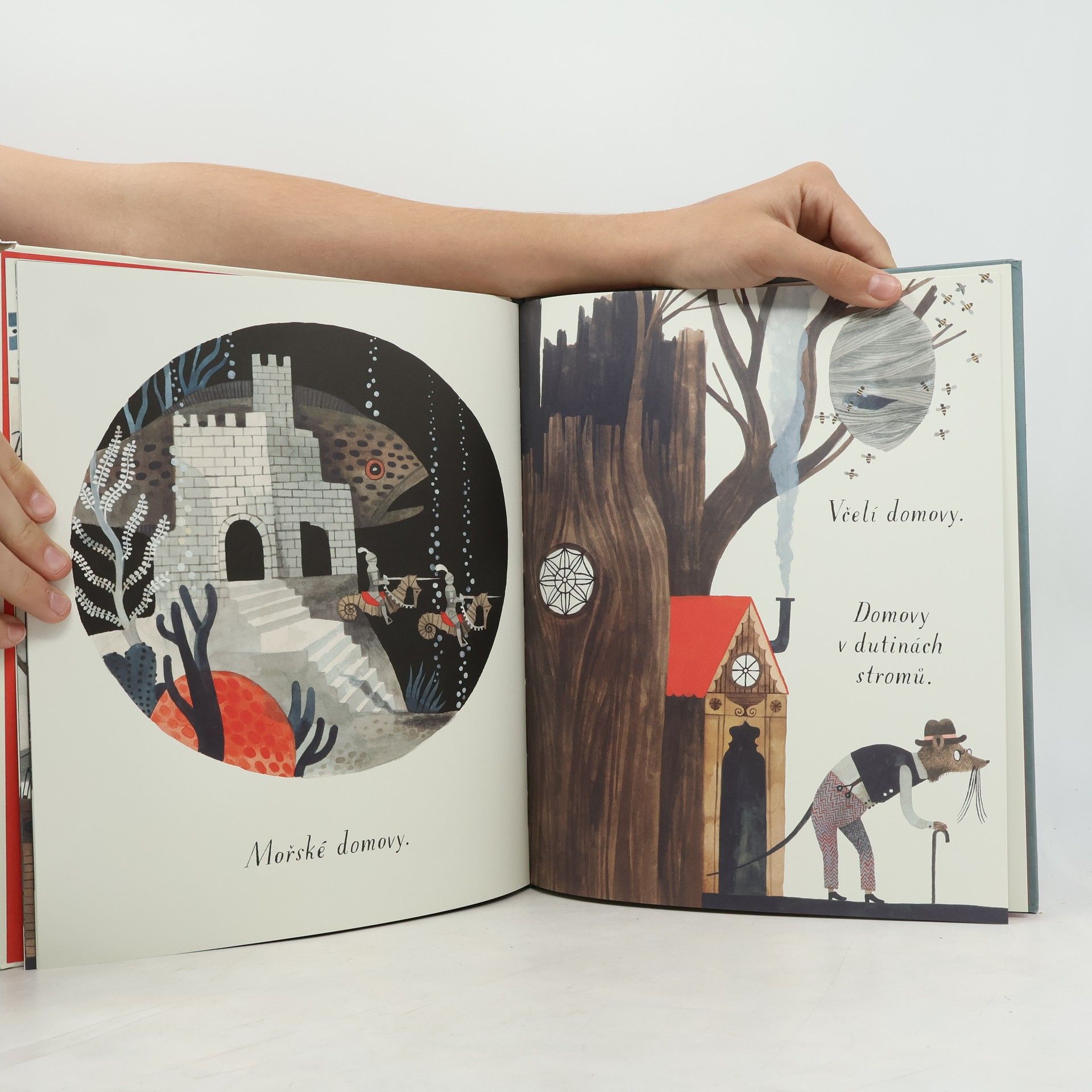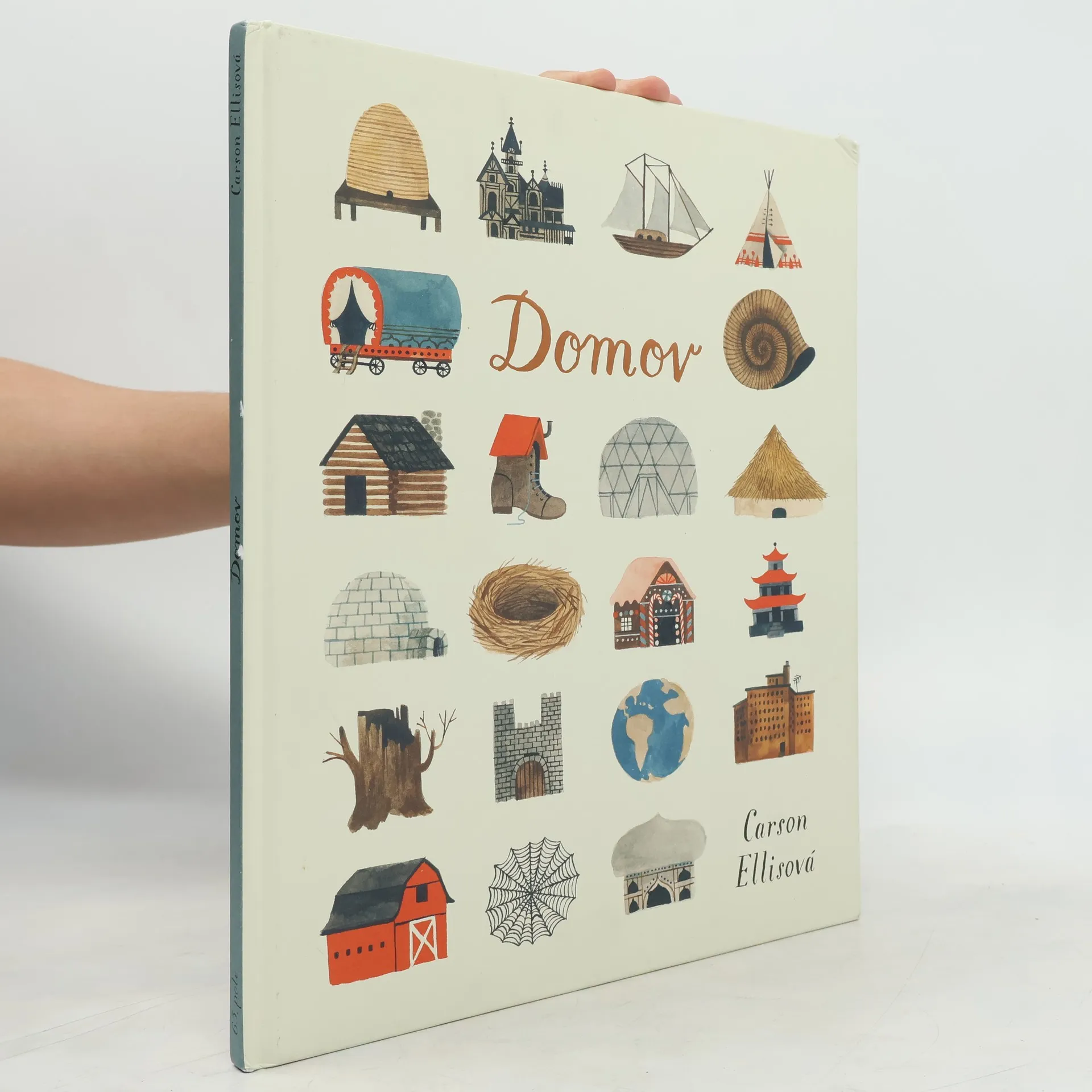 Vynikající malířka a ilustrátorka Carson Ellisová přichází se svou první autorskou knihou, ve které s humorem i nadsázkou představuje rozmanité podoby domova. Domov může být dům na venkově, byt ve městě nebo dokonce bota. Domov lze najít na cestě, pod vodou, v bájných světech i v autorčině ateliéru. Autorský debut oceňované ilustrátorky je laskavým pohledem na místa, která lze (někdy s notnou dávkou fantazie) označit jako domov, a vybízí tak k zamyšlení nad tím, co pro nás vlastně domov znamená. Svou bohatou vizuální stránkou čtenáře láká, aby se ke knize opakovaně vracel. Ilustrace ukrývají spoustu drobných detailů, které při každém dalším čtení nabídnou nové významy. Průvodkyní celou knihou je holubice z titulní strany. Silueta v okně prvního domova se při bližším pohledu proměňuje v čepici dívky na poslední dvoustraně. V závěru se tak ukazuje, jak bydlí sama autorka, a předměty, které čtenář mohl objevit na předchozích stranách (korouhvička, loď v lahvi, globus, černobílá látka, klobouk s krempou) nacházejí své místo u malířky doma. Právě tyto předměty nabízejí prostor k zastavení, zamyšlení i opakovanému čtení. Všímavý čtenář může neustále objevovat nové a nové detaily.
