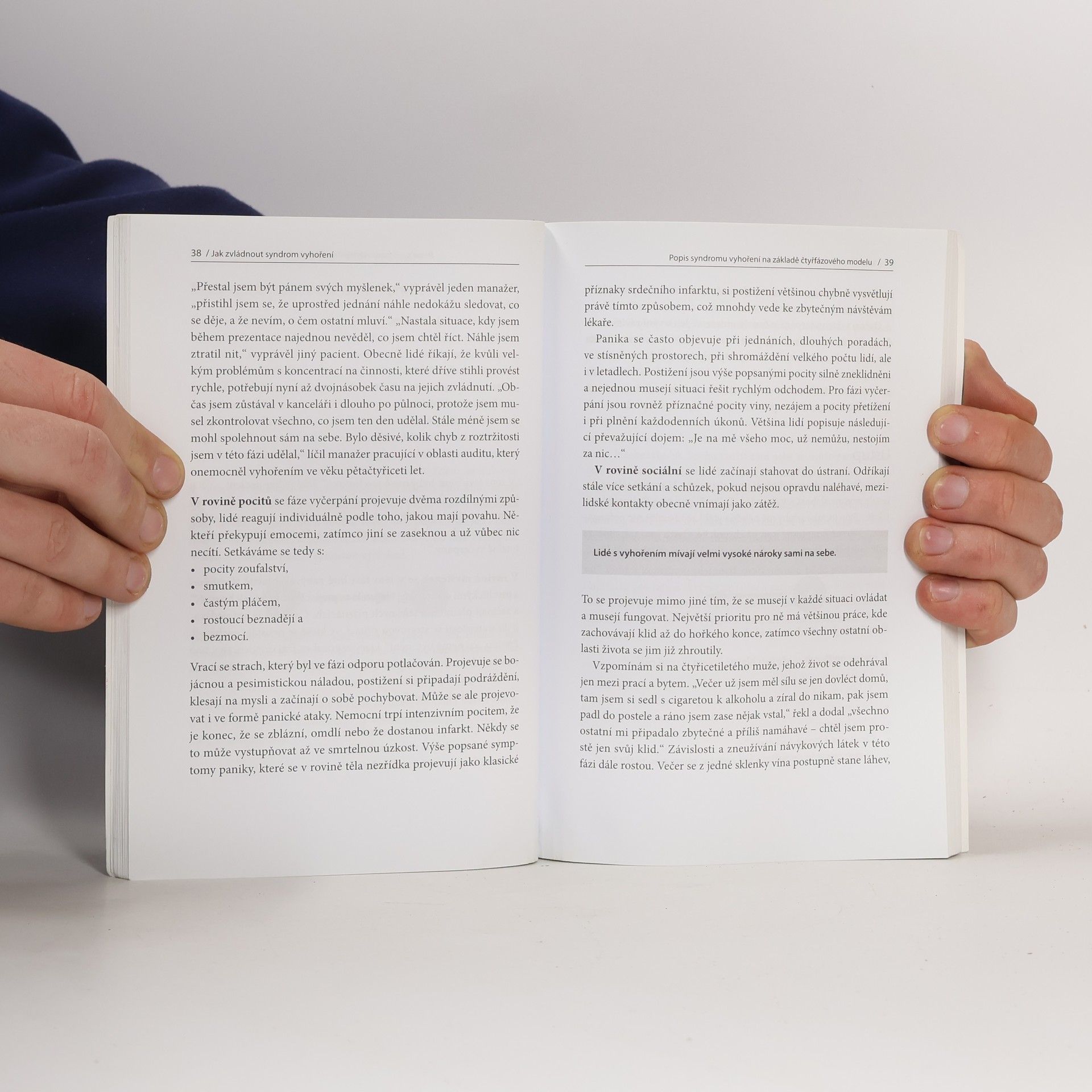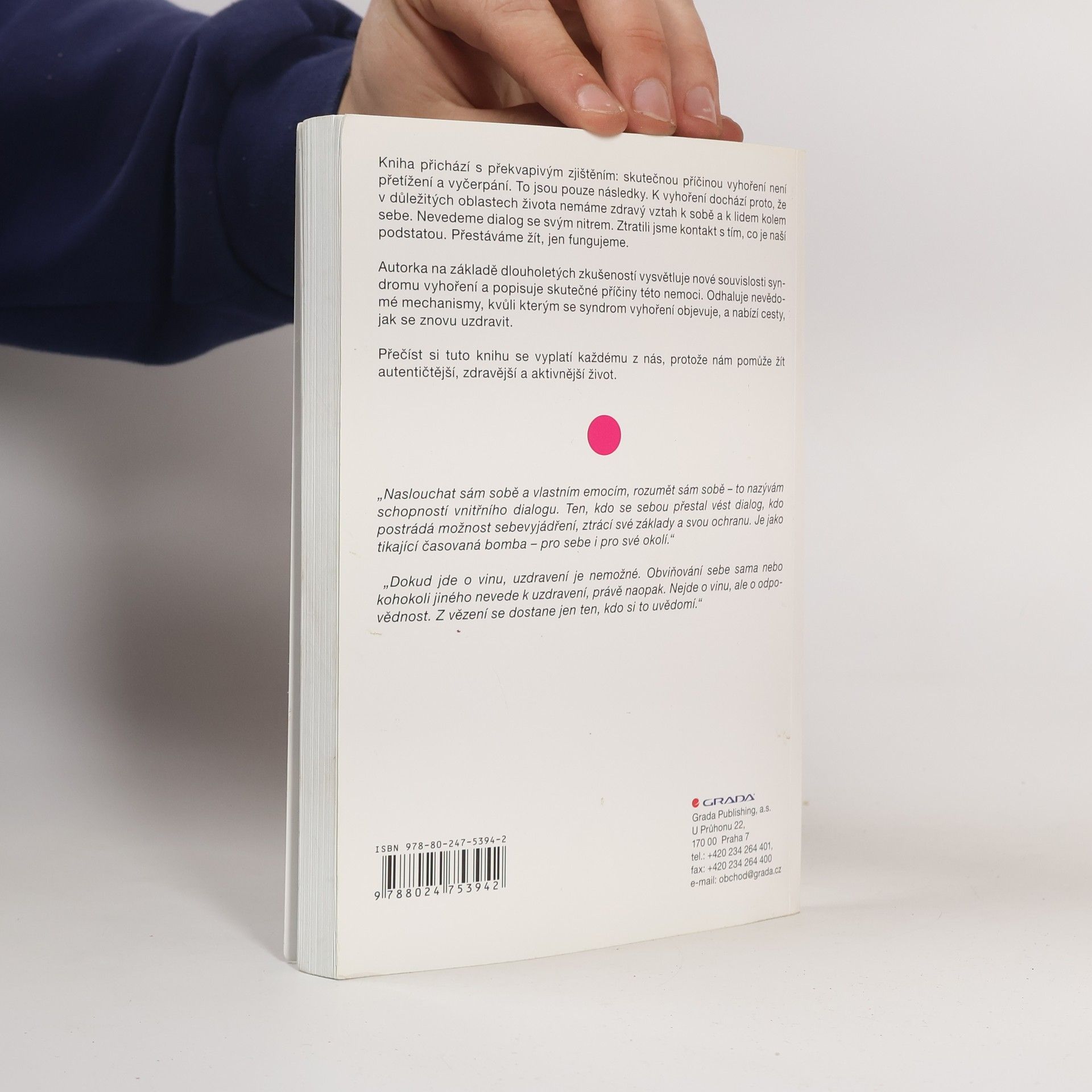 Kniha přichází s překvapivým zjištěním: skutečnou příčinou vyhoření není přetížení a vyčerpání. To jsou pouze následky. K vyhoření dochází proto, že v důležitých oblastech života nemáme zdravý vztah k sobě a k lidem kolem sebe. Nevedeme dialog se svým nitrem. Ztratili jsme kontakt s tím, co je naší podstatou. Přestáváme žít, jen fungujeme. Autorka na základě dlouholetých zkušeností vysvětluje nové souvislosti syndromu vyhoření a popisuje skutečné příčiny této nemoci. Odhaluje nevědomé mechanismy, kvůli kterým se syndrom vyhoření objevuje, a nabízí cesty, jak se znovu uzdravit. Přečíst si tuto knihu se vyplatí každému z nás, protože nám pomůže žít autentičtější, zdravější a aktivnější život.