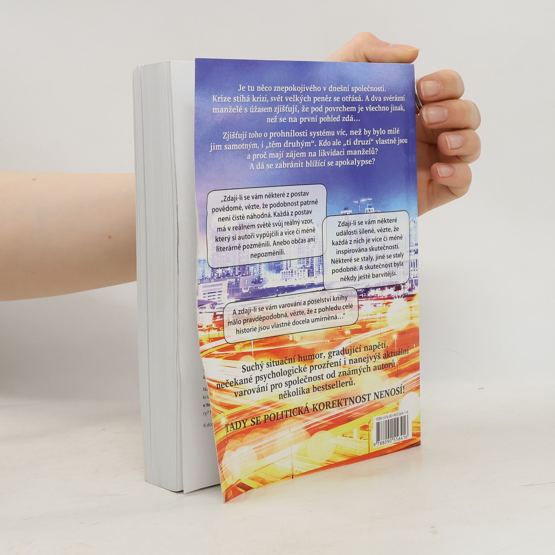 Je tu něco znepokojivého v dnešní společnosti. Krize stíhá krizi, svět velkých peněz se otřásá. A dva svérázní manželé s úžasem zjišťují, že pod povrchem je všechno jinak, než se na první pohled zdá… Zjišťují toho o prohnilosti systému dokonce víc, než by bylo milé jim samotným, i „těm druhým“. Kdo ale „ti druzí“ vlastně jsou a proč mají zájem na likvidaci manželů? A dá se zabránit blížící se apokalypse? Suchý situační humor, gradující napětí, nečekané psychologické prozření i nanejvýš aktuální varování pro společnost v příběhu od známých autorů několika bestsellerů. Tady se politická korektnost nenosí! Zdají-li se vám některé z postav či událostí povědomé, vězte, že podobnost patrně není čistě náhodná. Každá z postav i událostí má v reálném světě svůj reálný vzor, který si autoři vypůjčili a více či méně literárně pozměnili. Anebo občas ani nepozměnili. A zdají-li se vám varování a poselství knihy šílená, vězte, že z pohledu celé historie jsou vlastně docela umírněná…