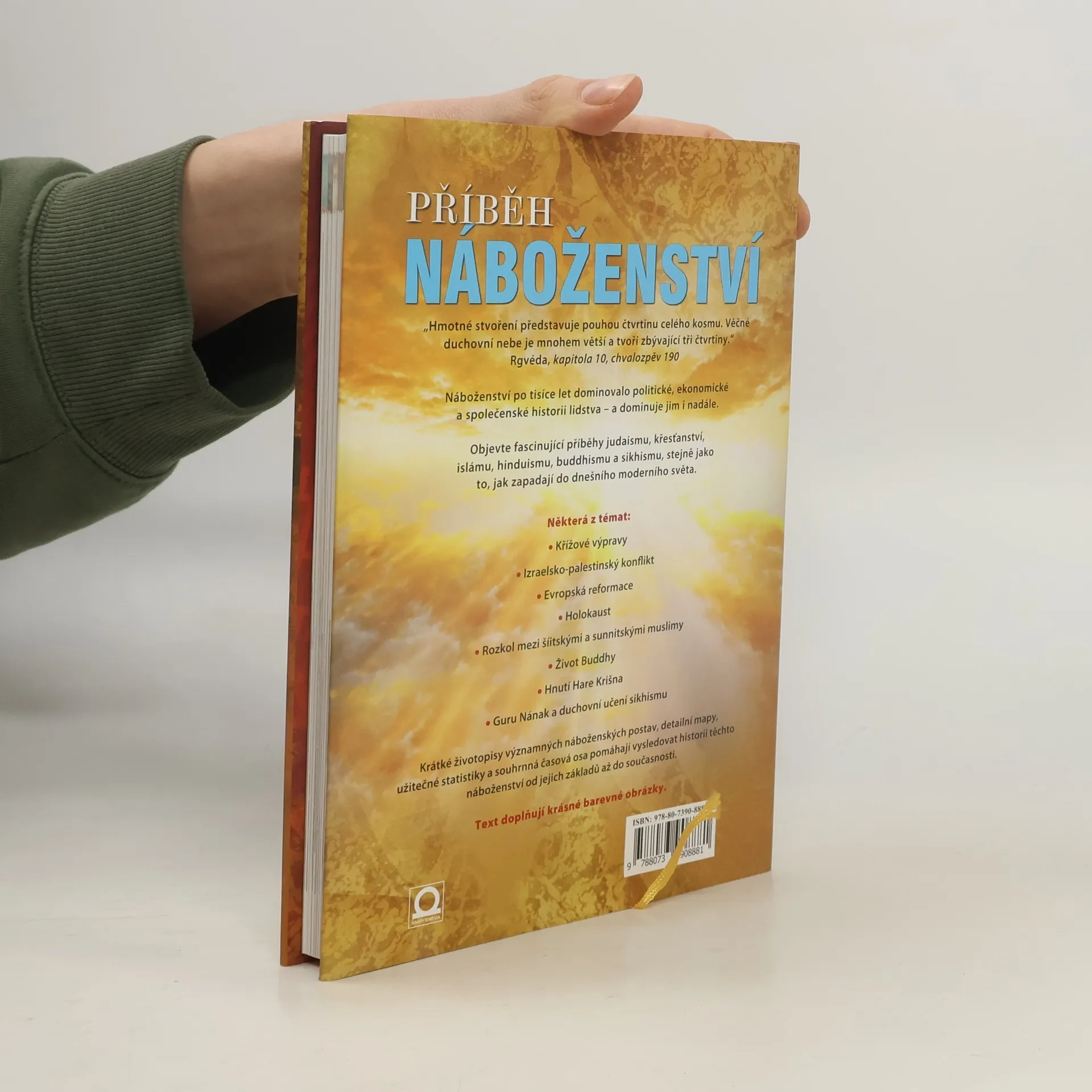 Kompletní historie nejdůležitějších náboženských směrů. Publikace sleduje historii nejdůležitějších náboženství světa, od jejich založení až po současnost. Unikátní vývoj dokreslují historické mapy, životopisy slavných náboženských vůdců, statistiky, přehledy svátků i časové osy. Dočítáme se primárně o buddhismu, křesťanství, hinduismu, islámu, judaismu a sikhismu. Výklad je doplněn příběhy prostých věřících z dávné historie a popisem tradicionalismu. Publikace obsahuje více než 100 barevných fotografií.