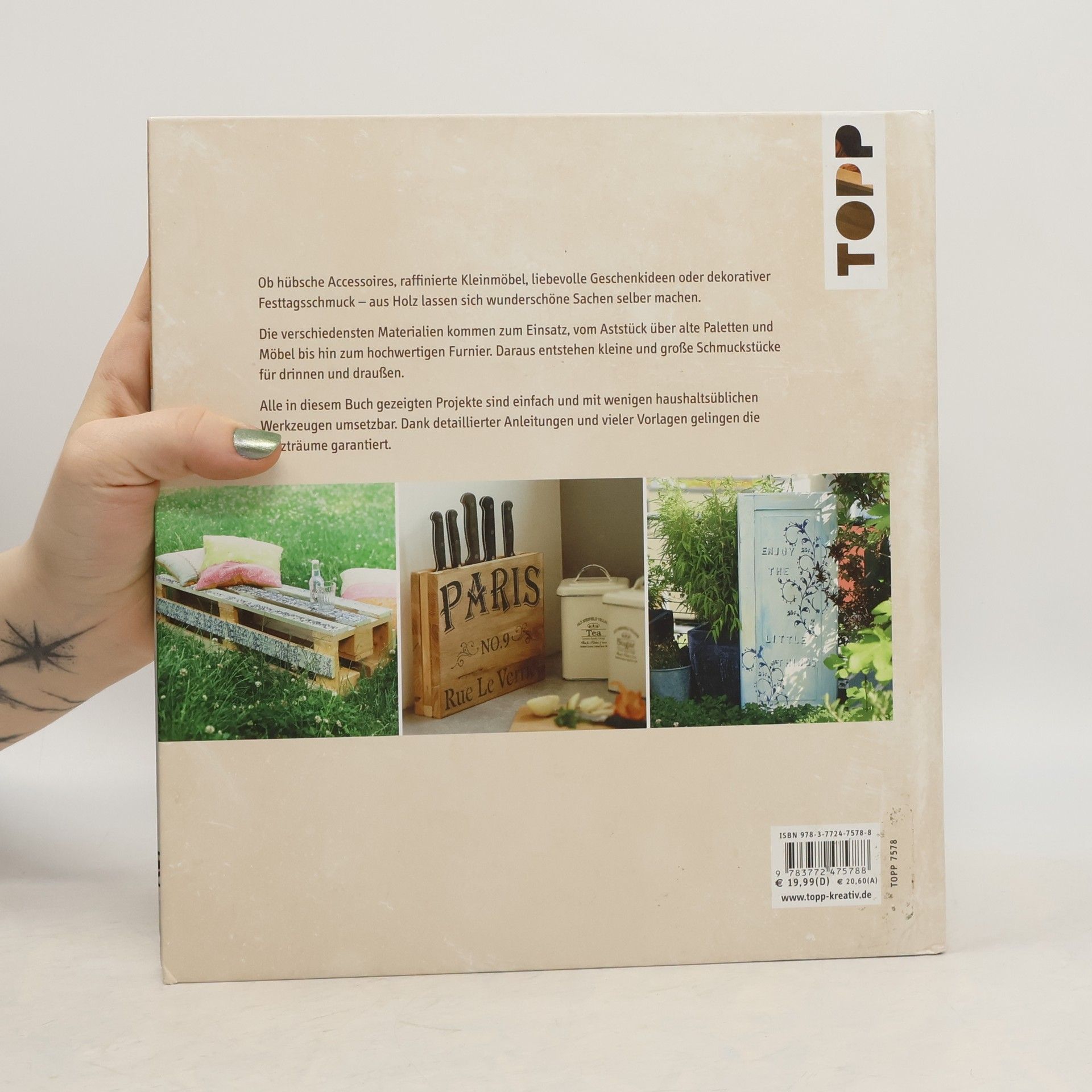 Dekorative Holzideen für kreative Frauen, die ihren Wohnraum natürlich schön gestalten wollen. Im Buch finden sie hübsche Ideen für sich selbst oder zum Verschenken; sowohl für drinnen als auch draußen. Ob raffinierte Möbel, hübsche Accessoires, liebe Gaben oder schöner Festtagsschmuck: Alle Projekte sind einfach und ohne Werkstatt umsetzbar. Inklusive beliebter Gestaltungstechniken wie Upcycling, Fototransfer, Vergolden und Brandmalerei. Neben Fertigholz aus dem Baumarkt kommen auch Paletten, Altholz sowie Furnierholz zum Einsatz.