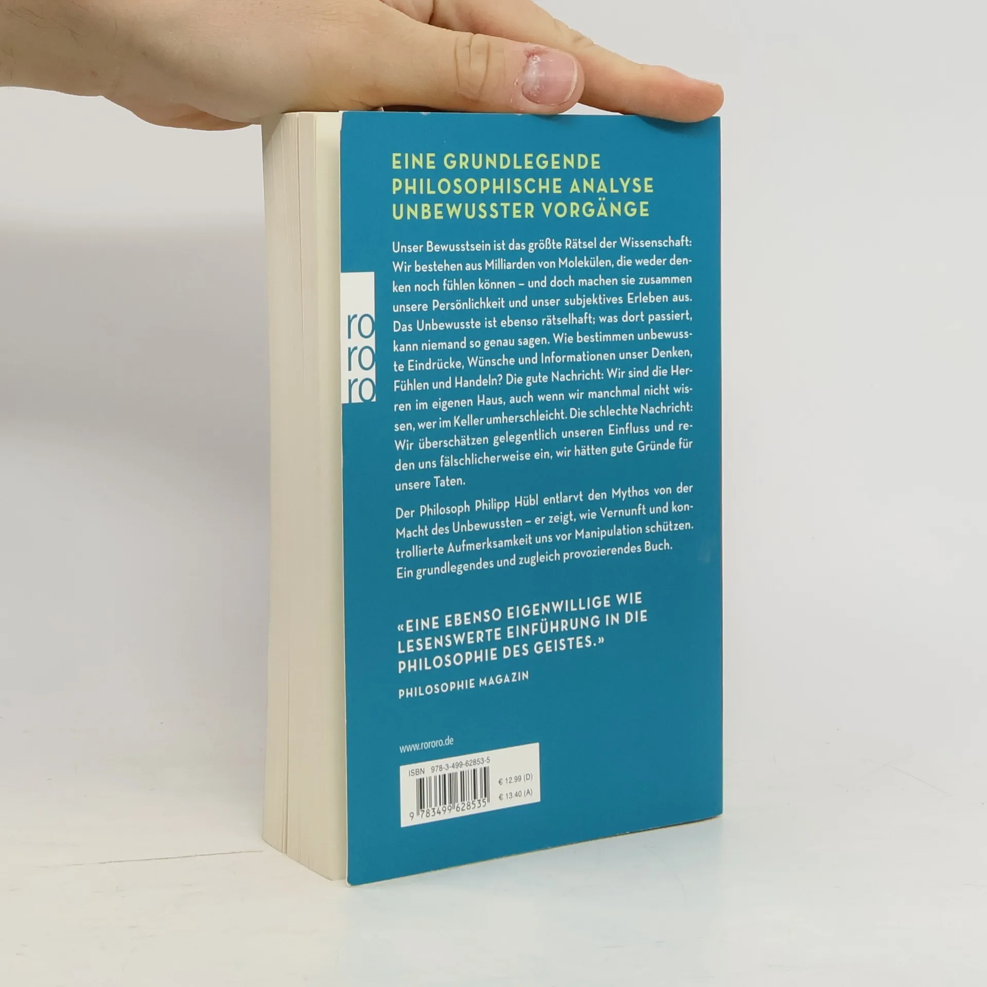Eine grundlegende philosophische Analyse unbewusster Vorgänge Unser Bewusstsein ist das größte Rätsel der Wissenschaft: Wir bestehen aus Milliarden von Molekülen, die weder denken noch fühlen können – und doch machen sie zusammen unsere Persönlichkeit und unser subjektives Erleben aus. Das Unbewusste ist ebenso rätselhaft; was dort passiert, kann niemand so genau sagen. Wie bestimmen unbewusste Eindrücke, Wünsche und Informationen unser Denken, Fühlen und Handeln? Die gute Nachricht: Wir sind die Herren im eigenen Haus, auch wenn wir manchmal nicht wissen, wer im Keller umherschleicht. Die schlechte Nachricht: Wir überschätzen manchmal unseren Einfluss und reden uns fälschlicherweise ein, wir hätten gute Gründe für unsere Taten. Der Philosoph Philipp Hübl entlarvt den Mythos von der Macht des Unbewussten – er zeigt, wie Vernunft und kontrollierte Aufmerksamkeit uns vor Manipulation schützen. Ein ebenso grundlegendes wie provozierendes Buch. «Luzide geschrieben, wärmstens zu empfehlen.» Frankfurter Allgemeine Zeitung über «Folge dem weißen Kaninchen»