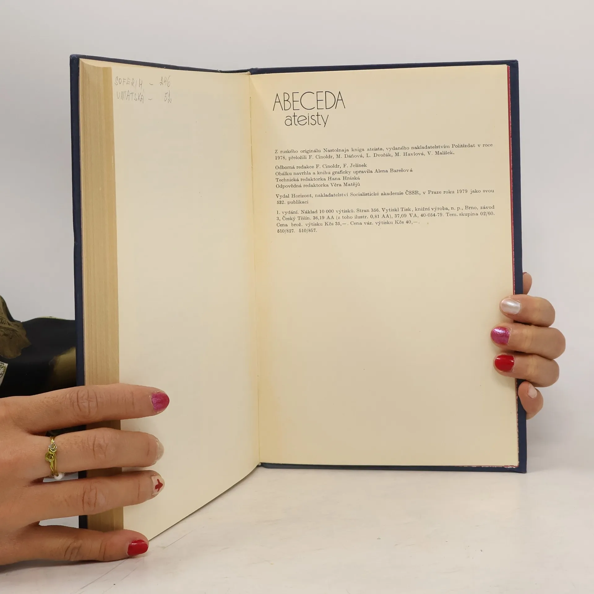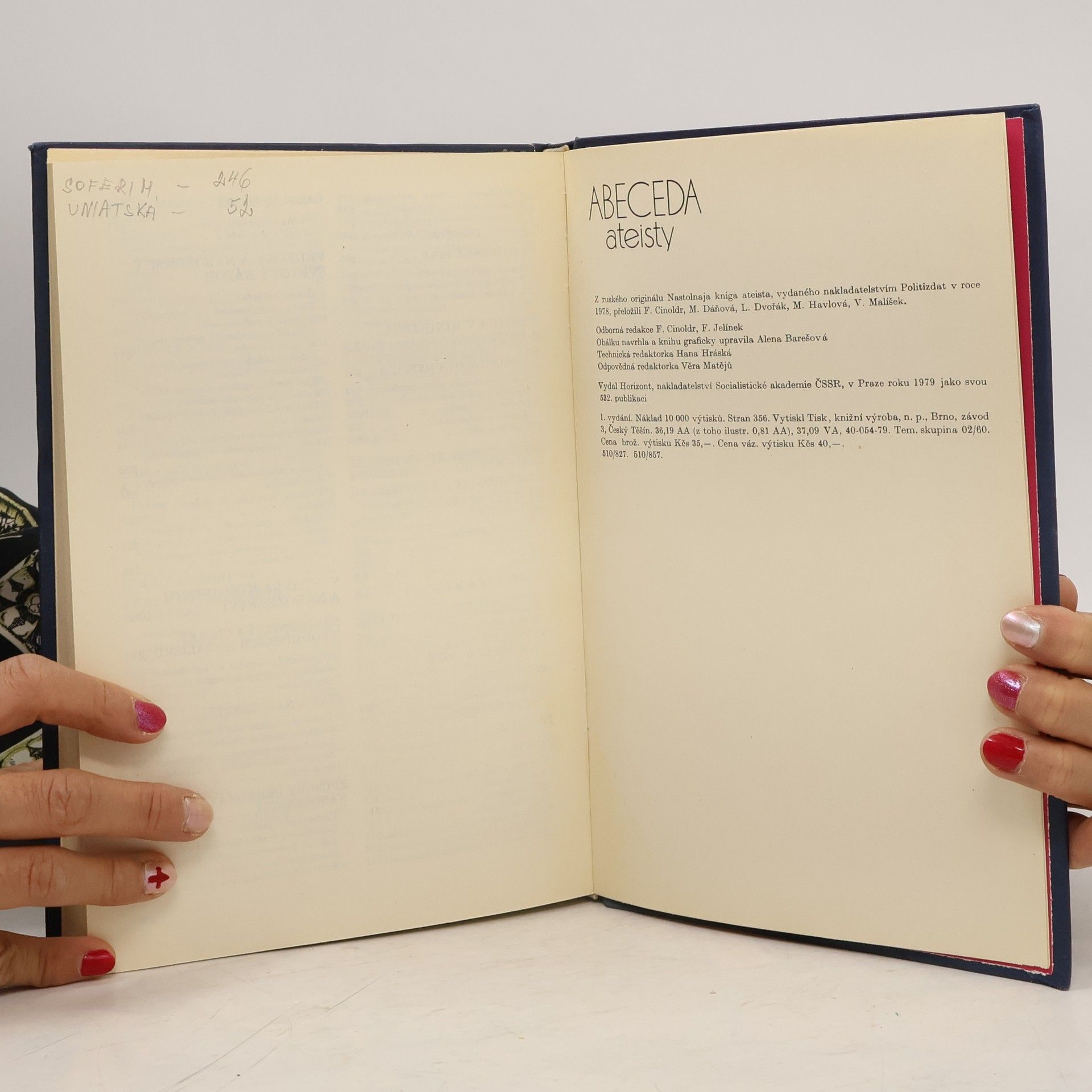 Informace, fakta a návody pro argumentaci ateistů. Zpracoval kolektiv sovětských autorů pod vedením akademika S. D. Skazkina. Encyklopedickou formou zpracovávají autoři nejdůležitější otázky z historie, teorie i praxe náboženství a ateismu. Seznamují s postavením náboženství v jednotlivýchzemích světa, charakterizují hlavní náboženské směry, zásady jejich morálky a kulty. Všímají si zvláštností náboženské psychologie, srovnávají vědecký a náboženský světový názor aj.