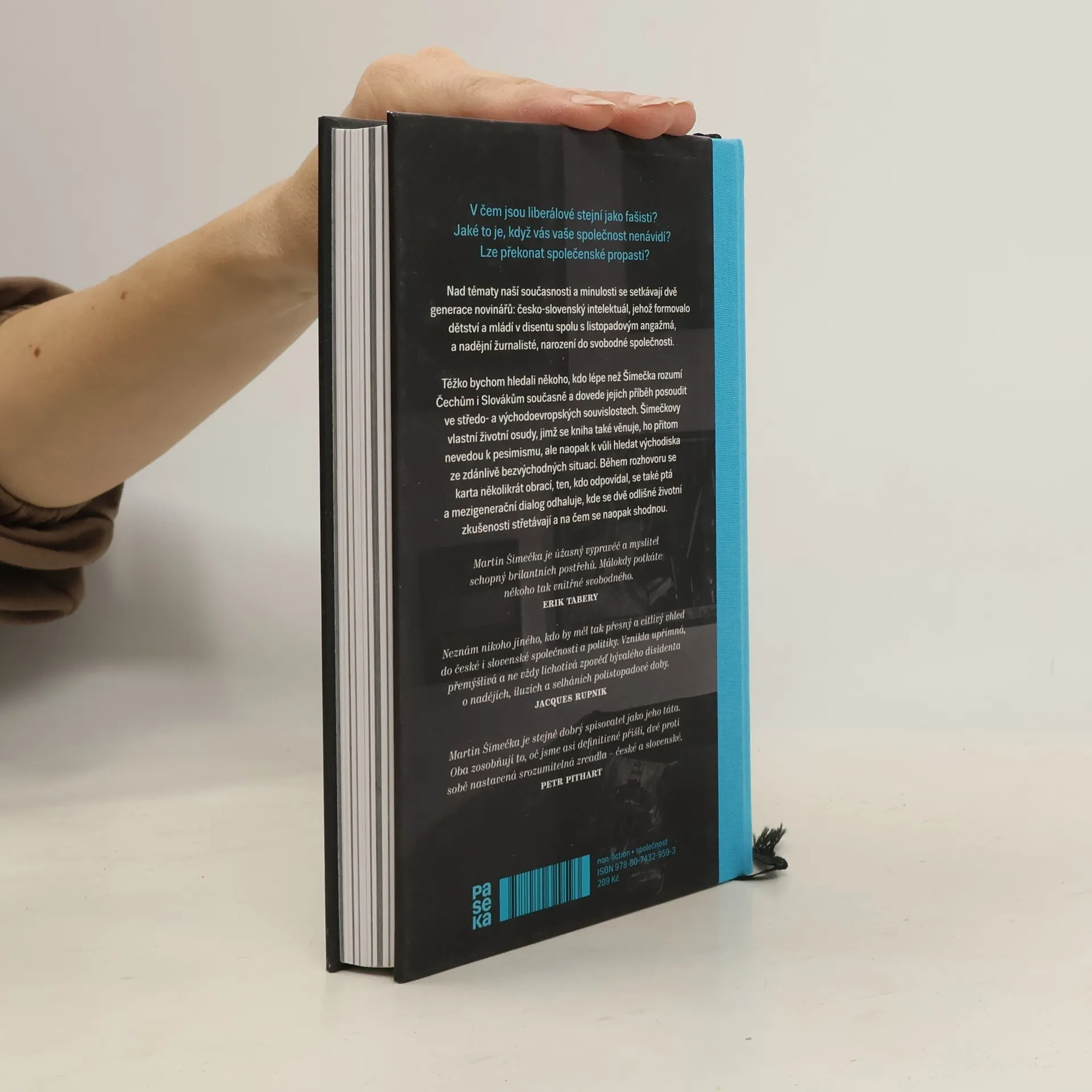 V čem jsou liberálové stejní jako fašisti? Jaké to je, když vás vaše společnost nenávidí? Nad tématy naší současnosti a minulosti se setkávají dvě generace novinářů s odlišnou zkušeností. Československý intelektuál, jehož formovalo dětství a mládí v disentu spolu s listopadovým angažmá, a nadějní žurnalisté, narození do svobodné společnosti. Těžko bychom hledali někoho, kdo lépe než Šimečka rozumí Čechům i Slovákům současně a dovede jejich příběh posoudit ve středo- a východoevropských souvislostech. Šimečkovy vlastní životní osudy, s nimiž se také seznámíme, ho přitom nevedou k pesimismu, ale naopak k vůli hledat východiska ze zdánlivě bezvýchodných situací. V závěru rozhovoru se karta obrací a zpovídaný se stává tázajícím, mladí novináři jsou tak postaveni před otázky týkající se rozdělené společnosti, generačního střetu a hodnot, které již nesdílí se svými rodiči.