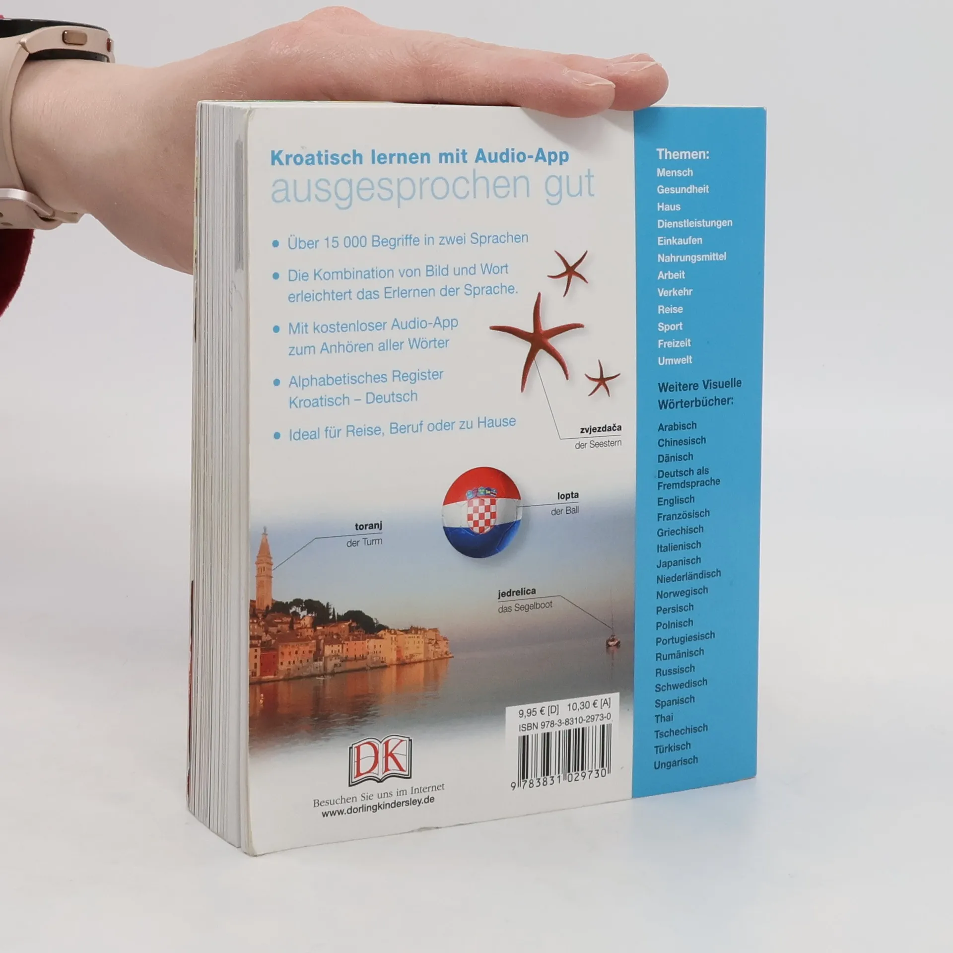 12.000 Wörter und Wendungen aus dem Alltagsleben werden thematisch geordnet anhand von Fotos, versehen mit kroatischem Begriff und deutscher Übersetzung vermittelt. In jedem Kapitel werden ausserdem einige wichtige Redewendungen und Sätze angezeigt, die beiden Register ermöglichen gezieltes Suchen. Zusätzlich neu gibt es nun eine umfangreiche separate deutsch-kroatische Verbliste und die kostenlose App zum Anhören aller Wörter. (2-3)