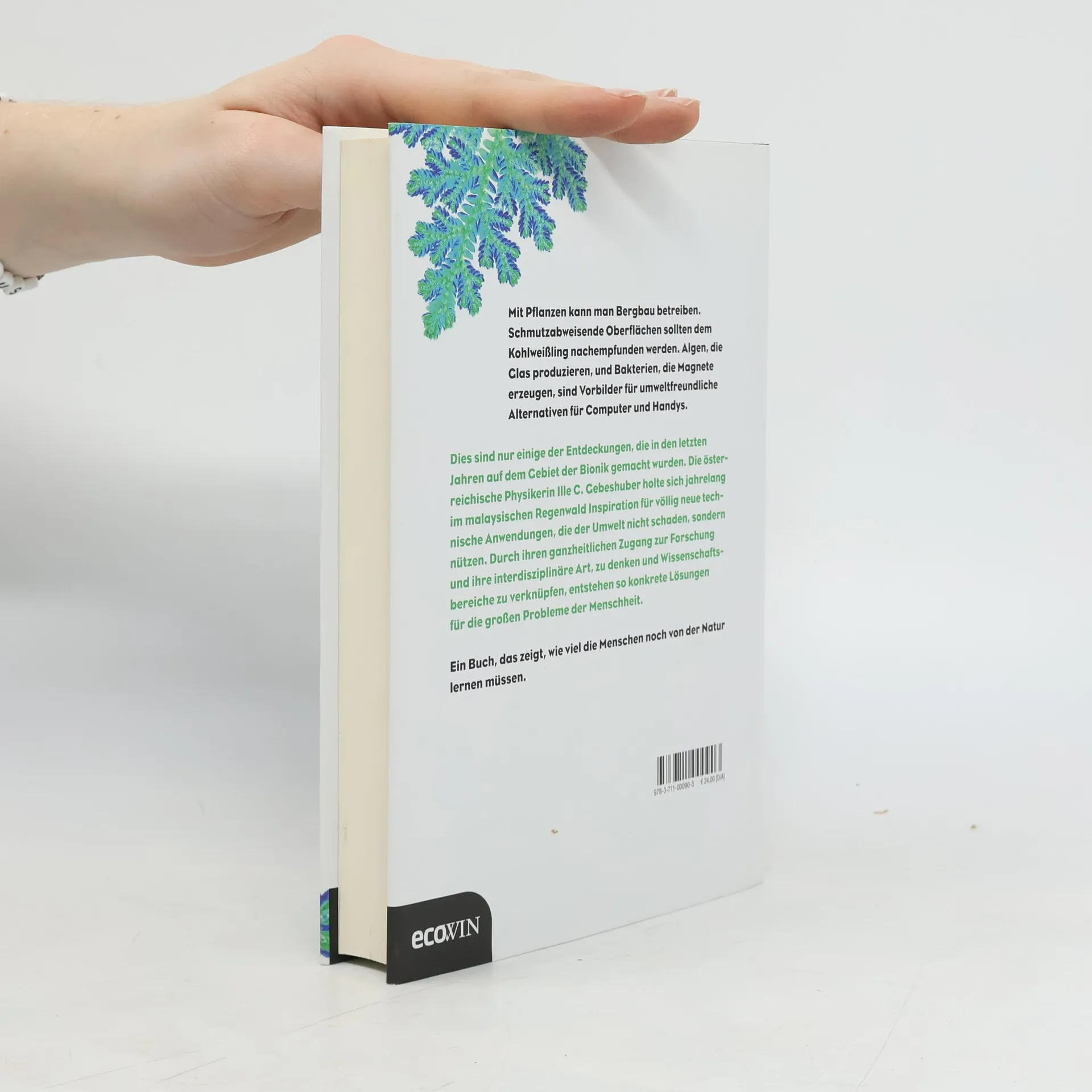 Mit Pflanzen kann man Bergbau betreiben. Schmutzabweisende Oberflächen sollten dem Kohlweißling nachempfunden werden. Algen, die Glas produzieren, und Bakterien, die Magnete erzeugen, sind Vorbilder für umweltfreundliche Alternativen für Computer und Handys. Dies sind nur einige der Entdeckungen, die in den letzten Jahren auf dem Gebiert der Bionik gemacht wurden. die österreichische Physikerin Ille C. Gebeshuber holte sich jahrelang im malaysischen Regenwald Inspiration für völlig neue technische Anwendungen, die der Umwelt nicht schaden, sondern nützen. Durch ihren ganzheitlichen Zugang zur Forschung uns ihre interdisziplinäre Art, zu denken und Wissenschaftsbereiche zu verknüpfen. entstehen so konkrete Lösungen für die großen Probleme der Menschheit. Ein Buch, das zeigt, wie viel die Menschen noch von der Natur lernen müssen.