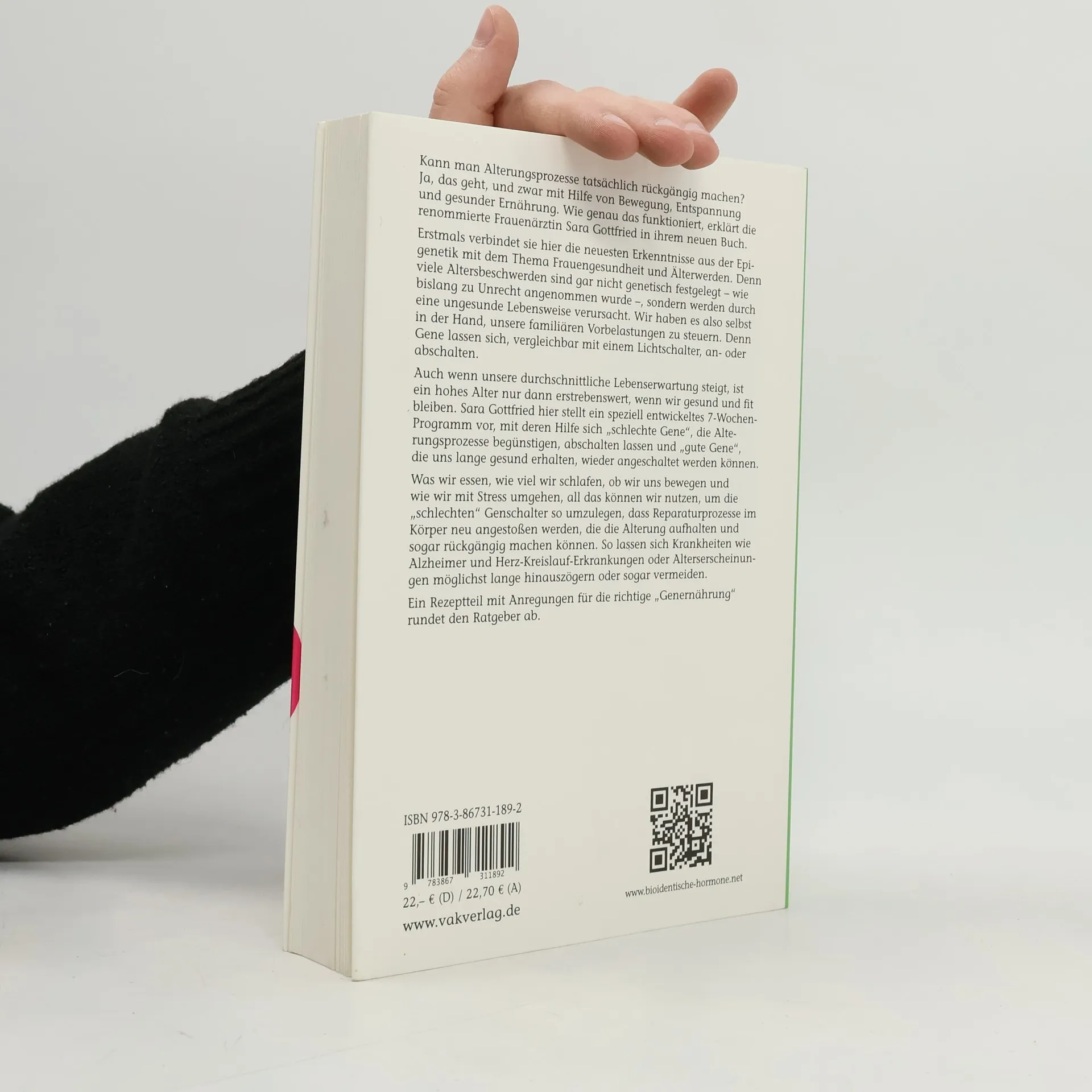 Die biologische Uhr zurückdrehen – mit der Kraft der Gene! Die Frauenärztin Sara Gottfried verbindet Erkenntnisse aus der Epigenetik mit Frauengesundheit und dem Älterwerden. Unsere Gene sind kein unabänderliches Schicksal, sondern können gezielt beeinflusst werden. Viele Altersbeschwerden resultieren nicht aus genetischen Faktoren, sondern aus ungesunden Lebensweisen. Wir können familiäre genetische Vorbelastungen steuern, da Gene wie Lichtschalter an- oder ausgeschaltet werden können. Eine steigende Lebenserwartung ist nur erstrebenswert, wenn wir gesund und fit bleiben. Gottfried präsentiert eine Methode, um „schlechte Gene“, die Alterungsprozesse fördern, auszuschalten und „gute Gene“, die uns gesund erhalten, zu aktivieren. Faktoren wie Ernährung, Schlaf, Bewegung und Stressbewältigung können genutzt werden, um die „schlechten“ Genschalter umzulegen, was Reparaturprozesse im Körper anstößt und die Alterung aufhalten oder sogar rückgängig machen kann. Ein speziell entwickeltes 7-Wochen-Programm hilft dabei, Gene zu „verjüngen“, sodass altersbedingte Krankheiten und Erscheinungen wie Falten und Gewichtszunahme verzögert oder vermieden werden. Die Maßnahmen umfassen Ernährung, Bewegung, biochemische Abläufe, Umwelteinflüsse, Stressmanagement und Schlafrhythmus. Ein umfangreicher Rezeptteil bietet Anregungen für die richtige „Genernährung“.