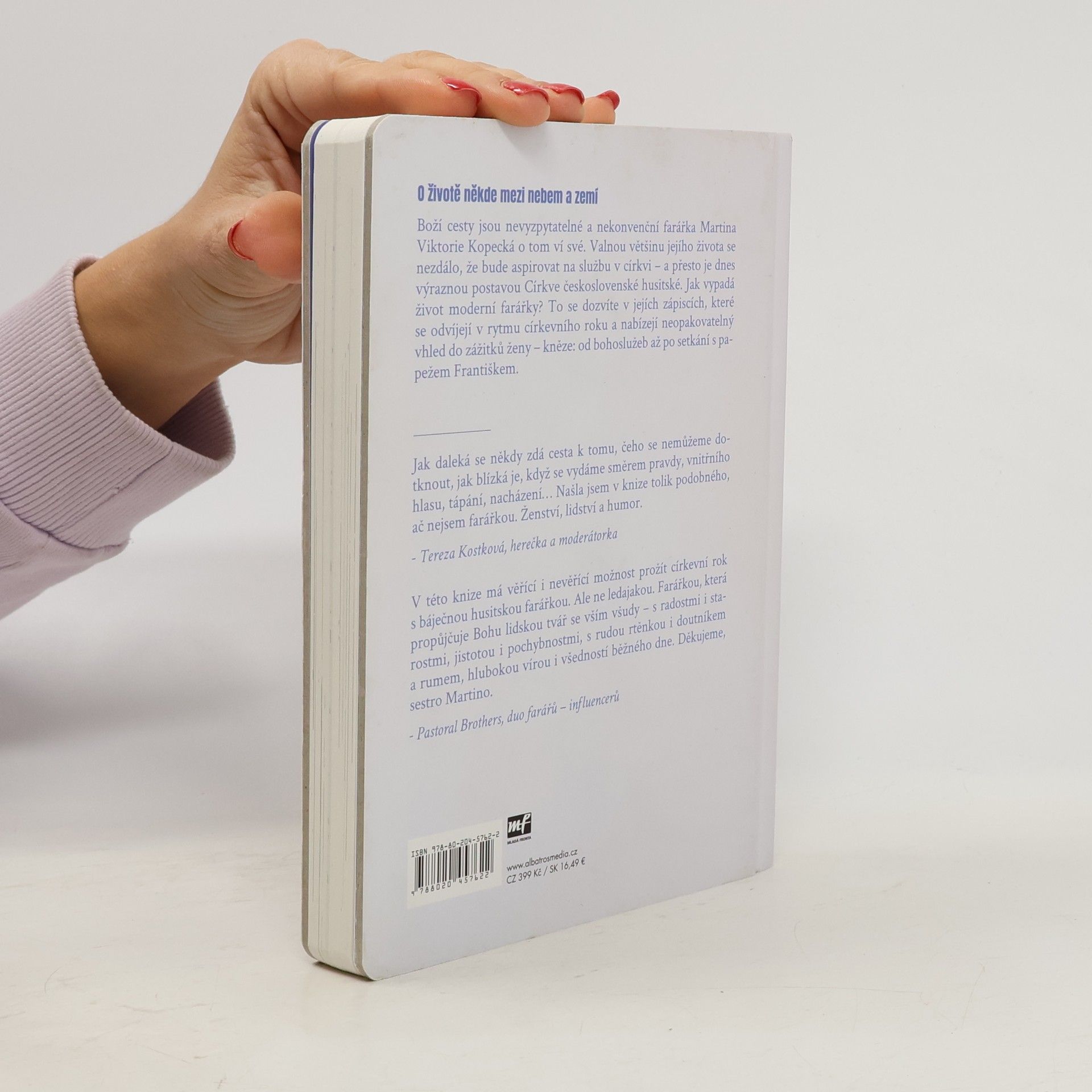 O životě někde mezi nebem a zemí. „Proboha! Tohle všechno se stalo za tři roky?“ Boží cesty jsou nevyzpytatelné a nekonvenční farářka Martina Viktorie Kopecká o tom ví své. Valnou většinu jejího života to nevypadalo, že bude aspirovat na službu v církvi – a přesto je dnes výraznou postavou Církve československé husitské. Knižní vydání blogu Deník farářky přináší zápisky posledních tří let a provádí čtenáře celým církevním rokem, který začíná adventem. Jaké to je být ženou – knězem? Čeho se kvůli službě musela vzdát? O čem přemýšlí, jak podle ní vypadá ráj a co by nám Ježíš pověděl, kdyby žil v dnes? S jakými předsudky se musí v životě vyrovnávat? V knize najdete úvahy, které se zdaleka netočí jen okolo náboženství, ale také vyprávění z cest po světě, příhody možné i dost nemožné, fotky, výstřižky z rozhovorů, vzpomínky na setkání, která mladé farářce bezmála změnila život. Přečtete si také její kázání, sny i otázky, na které není snadné odpovědět. Kniha vznikala v době pandemie, a tak se nevyhýbá ani tématům křehkosti života, smrti a snaze porozumět, co se to v naší společnosti děje, kam se poděla víra i kde hledat pevnou půdu pod nohama.