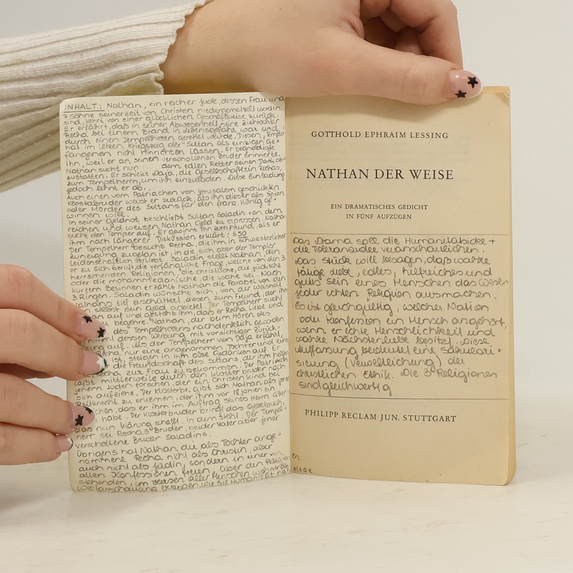 Mit Erläuterungen zu Autor, Text und Wirkung. Mensch sein Die Aussage in Lessings Nathan der Weise scheint so einfach Der Dichter hält es -- noch ganz im Zeichen der Aufklärung -- Ende des 18. Jahrhunderts für dringend nötig, an die Toleranz und Menschlichkeit seiner Zeitgenossen zu appellieren. Er tut das, indem er den weisen Nathan vorführt, und zeigt, wie dieser es schafft, unabhängig von Religion und Herkunft, einfach Mensch zu sein. Nathan lebt in Jerusalem, der Stadt der Weltreligionen, zur Zeit der Kreuzzüge. Seine angenommene Tochter Recha unterrichtet er statt im Judentum oder im Christentum, in Menschlichkeit. Eine Einstellung, die, als ein jeder unter dem Deckmäntelchen seiner Religion davon überzeugt ist, er vertrete die einzig wahren Werte, zwangsläufig zu Konflikten führen muß. Zu groß ist die Zahl der Intoleranten und Ignoranten. Doch Nathan kann in der berühmten Ringparabel seine Anschauung verdeutlichen: So, wie sich die drei exakt gleichen Ringe nicht unterscheiden lassen, so kann auch unter den Religionen von Juden, Christen und Moslems nicht entschieden werden, welche von ihnen den echten Glauben darstellt. Am Ende kann Nathan die Zweifler von seiner Haltung überzeugen. Dafür benötigt der Weise nicht mehr als zwei Stunden. Im Spiel auf der Bühne. Dann hat man verstanden: Toleranz und Menschlichkeit, das sind die höchsten Güter der Zivilisation. Heute -- Ende des 20. Jahrhunderts -- ist unsere Lebenswirklichkeit noch immer voll Intoleranz und Ignoranz. Und wir haben es immer noch nötig, erklärt zu bekommen, welches die eigentlichen Werte unserer Gesellschaft sind. Nathan der Weise kann uns ein guter Lehrmeister sein. Und seine Aussage ist eigentlich ganz einfach. --Anne Hauschild
