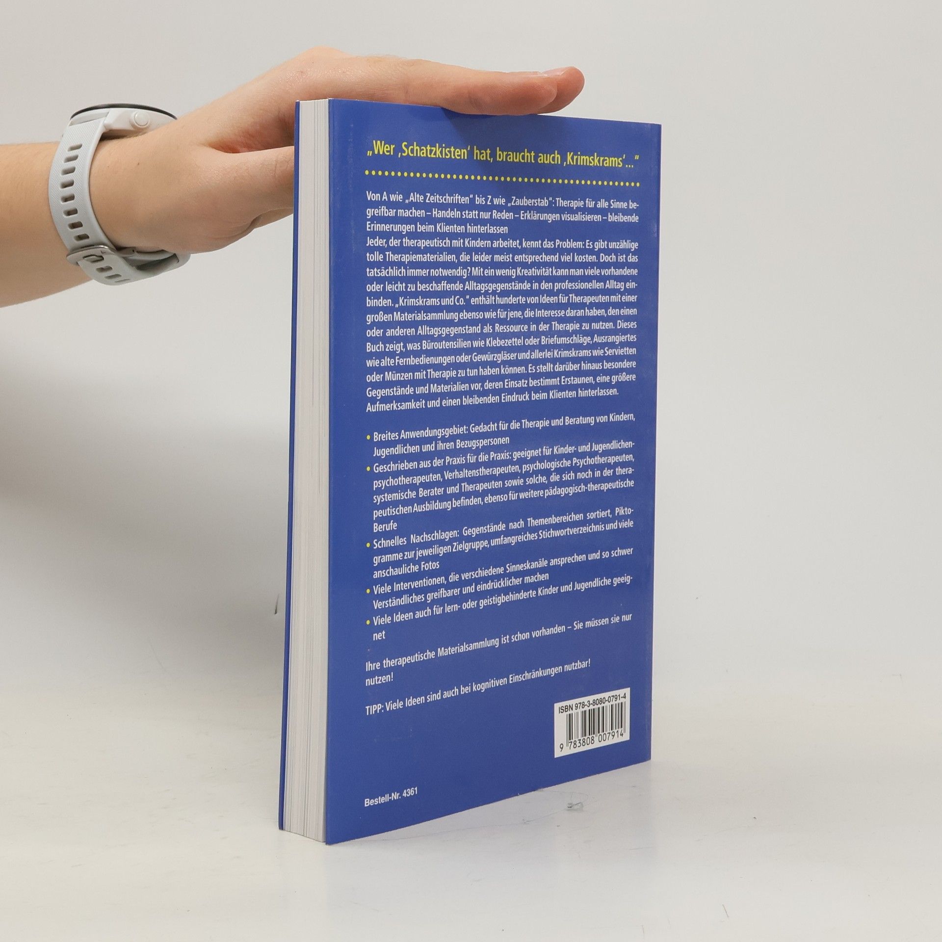 Von A wie "Alte Zeitschriften" bis Z wie "Zauberstab": Therapie für alle Sinne begreifbar machen – Handeln statt nur Reden – Erklärungen visualisieren – bleibende Erinnerungen beim Klienten hinterlassen. Therapeutisch mit Kindern zu arbeiten, bringt oft die Herausforderung mit sich, dass viele nützliche Therapiematerialien teuer sind. Doch ist das wirklich notwendig? Mit etwas Kreativität können viele alltägliche Gegenstände in den therapeutischen Alltag integriert werden. "Krimskrams und Co." bietet hunderte von Ideen für Therapeuten und solche, die Alltagsgegenstände als Ressourcen nutzen möchten. Das Buch zeigt, wie Büroutensilien wie Klebezettel, Ausrangiertes wie alte Fernbedienungen und Krimskrams wie Servietten in der Therapie eingesetzt werden können. Es stellt besondere Materialien vor, die Staunen und Aufmerksamkeit beim Klienten erzeugen. Die praktische Struktur ermöglicht schnelles Nachschlagen: Gegenstände sind nach Themen sortiert, mit Piktogrammen zur Zielgruppe und einem umfangreichen Stichwortverzeichnis sowie vielen anschaulichen Fotos. Die Interventionen sprechen verschiedene Sinneskanäle an und machen schwer Verständliches greifbarer und eindrücklicher.