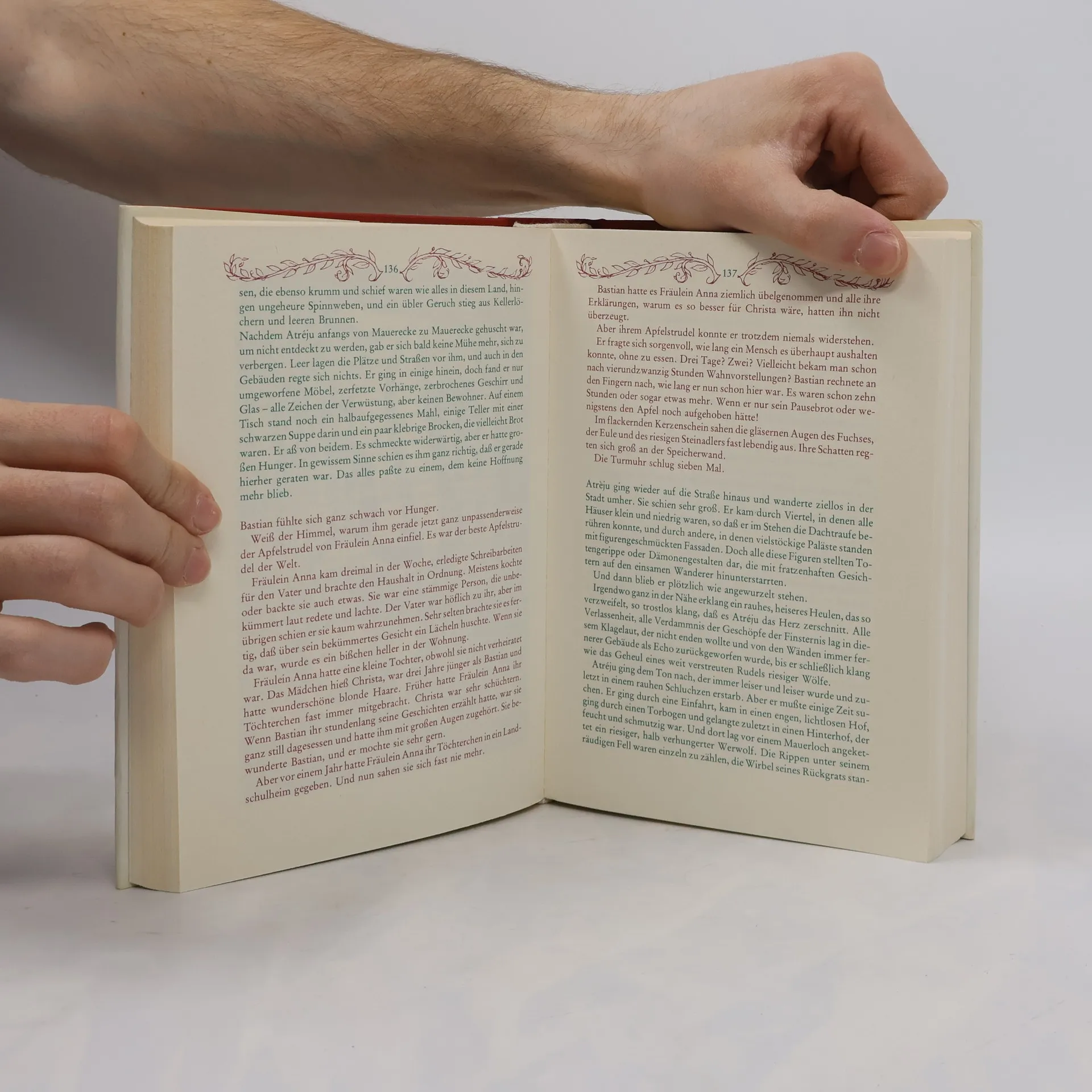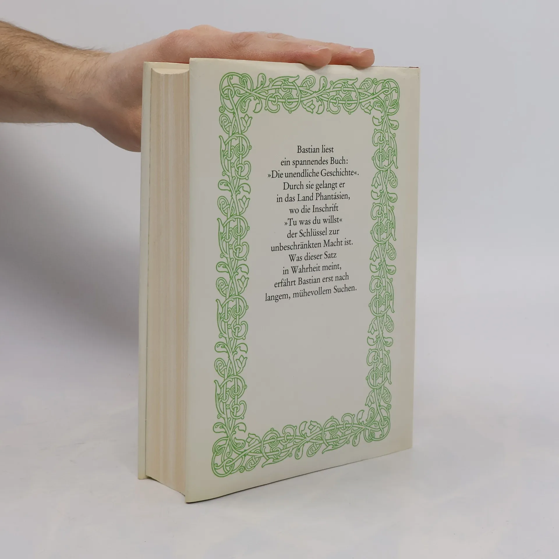 Der zehnjährige dickliche Bastian Balthasar Bux flüchtet sich vor den Nachstellungen der Schulkameraden in ein Antiquariat, wo ihn der Beginn eines Buches fasziniert, dessen Titel immer währendes Träumen verspricht. Bastian entwendet Die unendliche Geschichte und verliert sich auf dem Schulspeicher immer mehr in deren Lektüre: Die zunehmende Identifikation mit dem Helden Atréju ermöglicht ihm den Eintritt in die »Anderswelt«, in der er zum entscheidenden Protagonisten wird. Als Grenzgänger aus der Menschenwelt kommt ihm die Aufgabe zu, das vom »Nichts« bedrohte Phantásien und mit ihm dessen sterbenskranke »Kindliche Kaiserin« zu retten. Nach zahllosen Abenteuern auf dem Weg zu sich selbst, der von fantastischen Gestalten und mystischen Erkenntnissen gesäumt ist, löst Bastian mit Hilfe des »Wahren Willens« nicht nur seine Aufgabe, ihm gelingt auch die Rückkehr in die Realität, die er nun bewältigen kann.