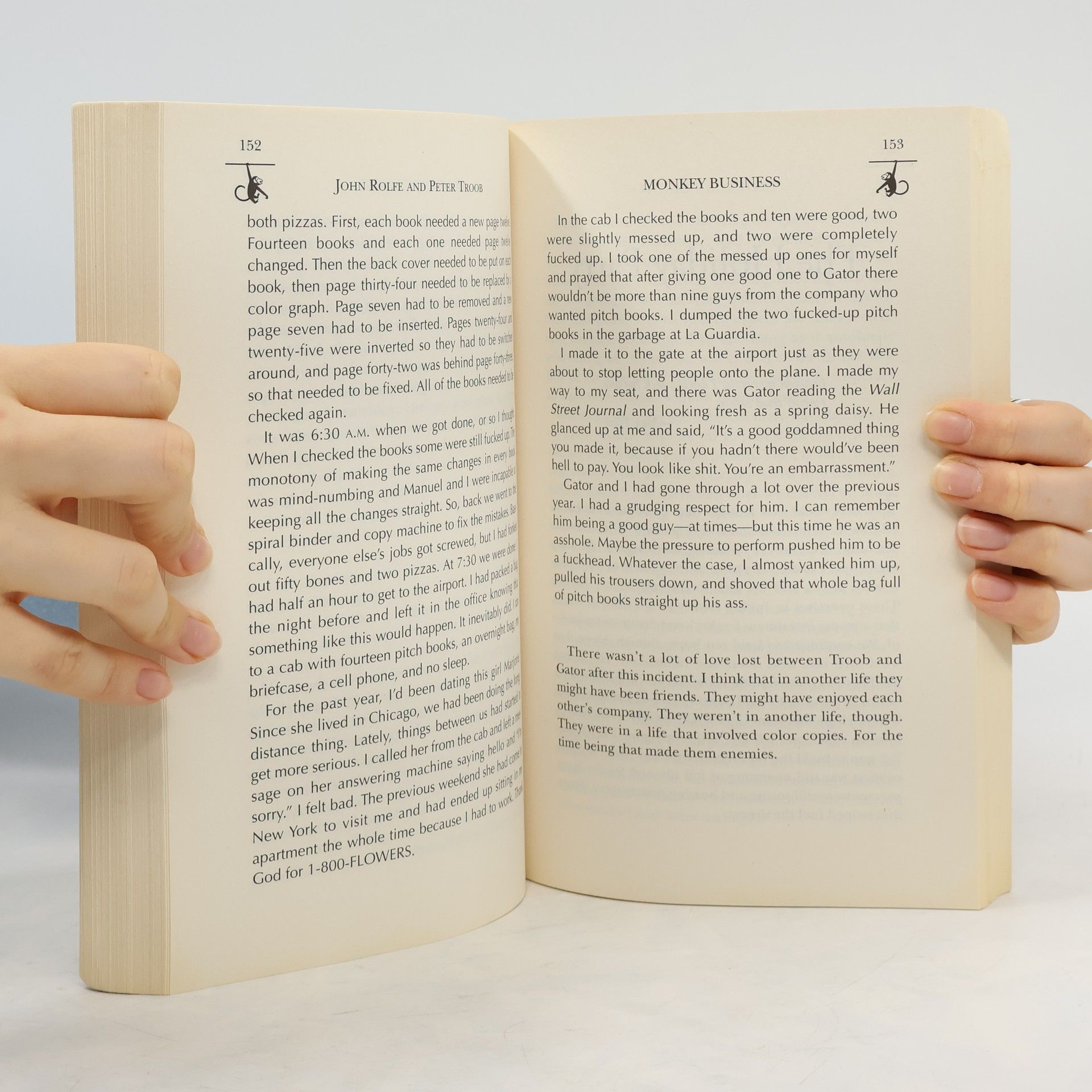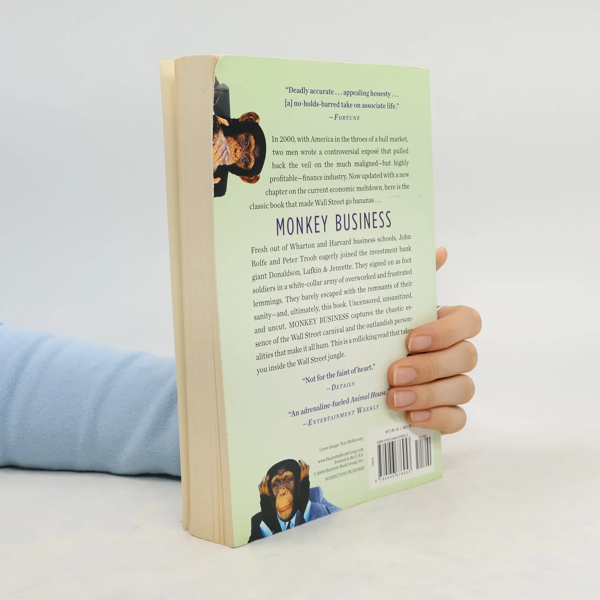 Animal House meets Liar's Poker in this hysterically funny, often unbelievable, and absolutely, positively true account of life at DLJ, one of the hottest investment banks on Wall Street."Like most other young business school graduates, John Rolfe and Peter Troob thought that life in a major investment banking firm would make their wildest dreams come true -- it would be fast-paced, intellectually challenging, glamorous, and, best of all, lucrative.They were in for a surprise. For behind the walls of Wall Street's firms lies a stratum of stunted, overworked, abused, and in the end, very well-compensated, but very frustrated men and women. Monkey Business takes readers behind the scenes at Donaldson, Lufkin, and Jenrette (DLJ), one of Wall Street's hottest firms of the 90s, from the interview process to the courting of clients to bonus time. It's a glimpse of a side of the business the financial periodicals don't talk about -- 20-hour work days, trips across the country where associates do nothing except carry the pitch book, strip clubs at night, inflated salaries, and high-powered, unforgettable personalities.Monkey Business provides readers with a first-class education in the real life of an investment banker. But best of all, it is an extremely funny read about two young men who, on their way towards achieving the American dream, quickly realized they were selling their souls to get there."