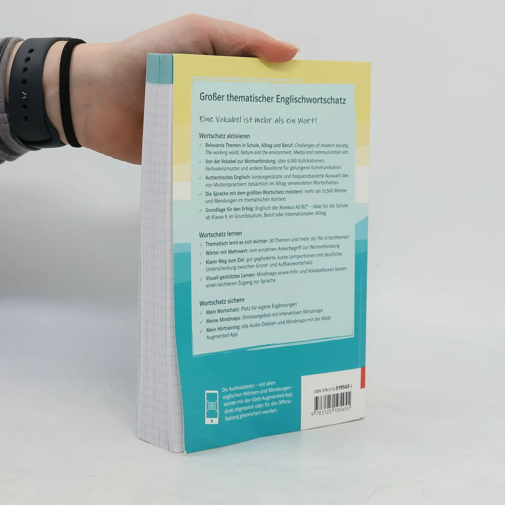 Der neue Wortschatz bis zum Abitur: Mehr als nur Vokabeln lernen – Kollokationen, Wortfamilien und chunks. Im Kontext macht es Sinn – Thematisch gruppierte Wortfelder erschließen . Echte Wendungen für echte Kommunikation – korpusgestützte Auswahl. Meine Motivation – Raum für individuelle Notizen und interaktive Mindmaps zur digitalen Bearbeitung. Mit allen Sinnen lernen – vollvertonte Inhalte, Infoboxen und Mindmaps . Multimediale Inhalte online verfügbar