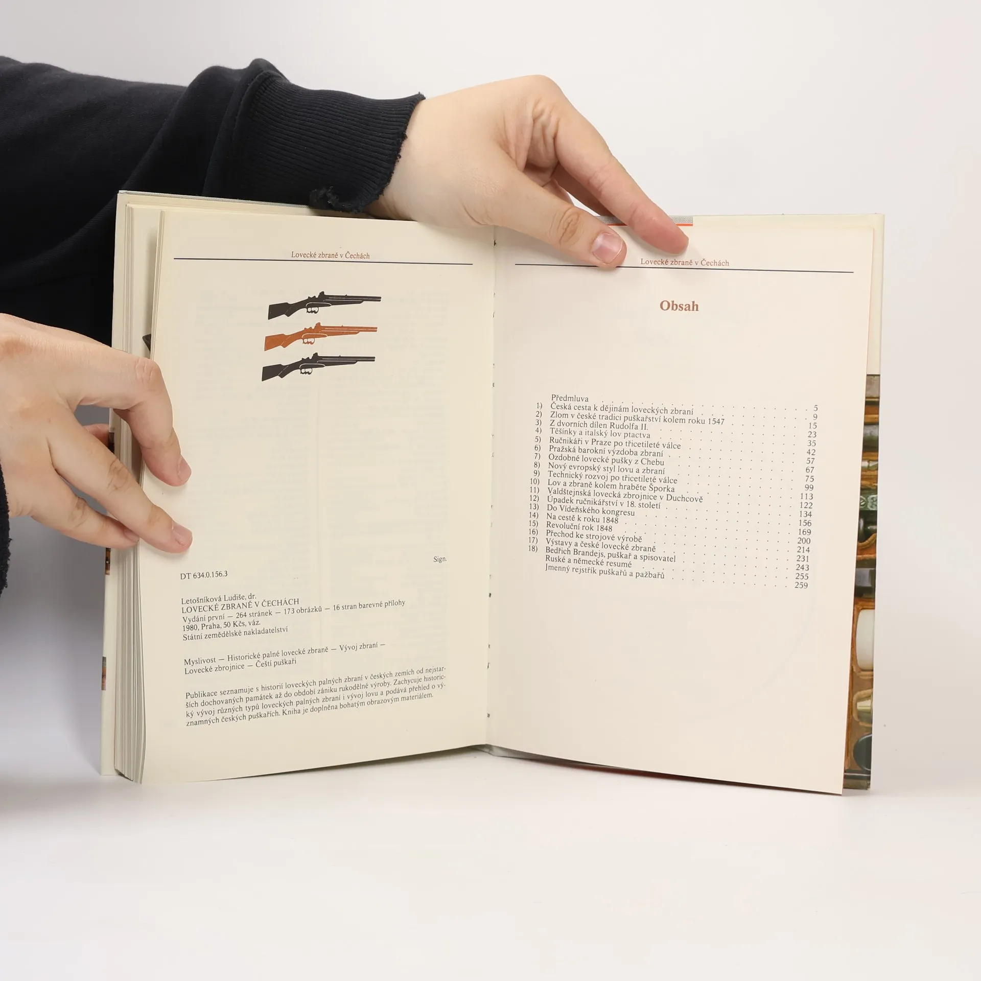 Publikace seznamuje s historií loveckých palných zbraní v českých zemích od nejstarších dochovaných památek až do období zániku rukodělné výroby. Zachycuje historický vývoj různých typů loveckých palných zbraní i vývoj lovu a podává přehled o významných českých puškařích. Fotočernobílé a barevné. Jmenný rejstřík puškařů a pažbařů.