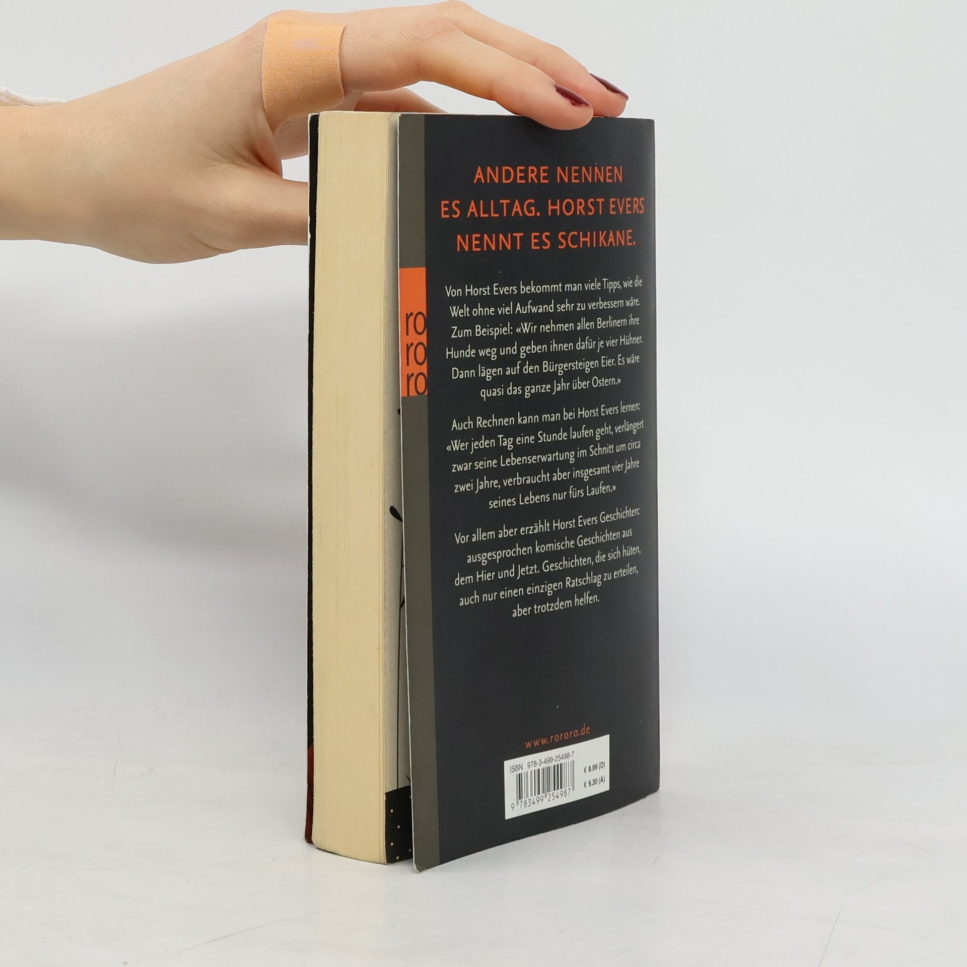 Andere nennen es Alltag. Horst Evers nennt es Schikane. Von Horst Evers bekommt man viele Tipps, wie die Welt ohne viel Aufwand sehr zu verbessern wäre. Zum Beispiel: «Wir nehmen allen Berlinern ihre Hunde weg und geben ihnen dafür je vier Hühner. Dann lägen auf den Bürgersteigen Eier. Es wäre quasi das ganze Jahr über Ostern.» Auch Rechnen kann man bei Horst Evers lernen: «Wer jeden Tag eine Stunde laufen geht, verlängert zwar seine Lebenserwartung im Schnitt um circa zwei Jahre, verbraucht aber insgesamt vier Jahre seines Lebens nur fürs Laufen.» Vor allem aber erzählt Horst Evers Geschichten: ausgesprochen komische Geschichten aus dem Hier und Jetzt. Geschichten, die sich hüten, auch nur einen einzigen Ratschlag zu erteilen, aber trotzdem helfen.