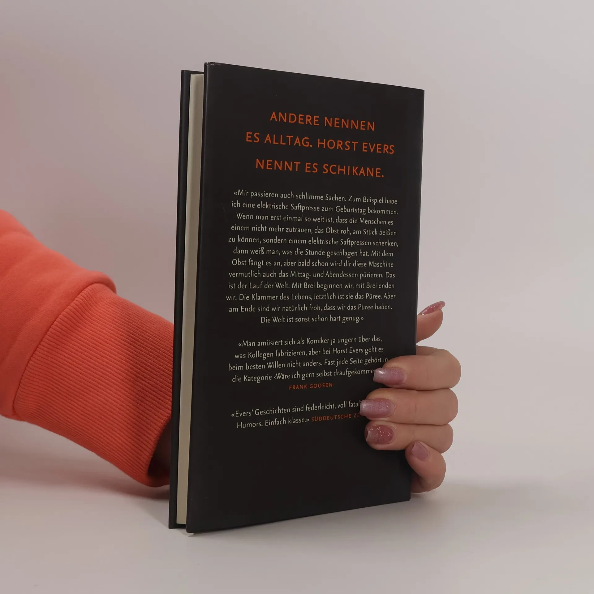 Andere nennen es Alltag. Horst Evers nennt es Schikane.«Mir passieren auch schlimme Sachen. Zum Beispiel habe ich eine elektrische Saftpresse zum Geburtstag bekommen. Wenn man erst einmal so weit ist, dass die Menschen es einem nicht mehr zutrauen, das Obst roh, am Stück beißen zu können, sondern einem elektrische Saftpressen schenken, dann weiß man, was die Stunde geschlagen hat. Mit dem Obst fängt es an, aber bald schon wird dir diese Maschine vermutlich auch das Mittag- und Abendessen pürieren. Das ist der Lauf der Welt. Mit Brei beginnen wir, mit Brei enden wir. Die Klammer des Lebens, letztlich ist sie das Püree. Aber am Ende sind wir natürlich froh, dass wir das Püree haben. Die Welt ist sonst schon hart genug.»«Man amüsiert sich als Komiker ja ungern über das, was Kollegen fabrizieren, aber bei Horst Evers geht es beim besten Willen nicht anders. Fast jede Seite gehört in die Kategorie ‹Wäre ich gern selbst draufgekommen›!» Frank Goosen«Evers’ Geschichten sind federleicht, voll fatalistischen Humors. Einfach klasse.» Süddeutsche Zeitung