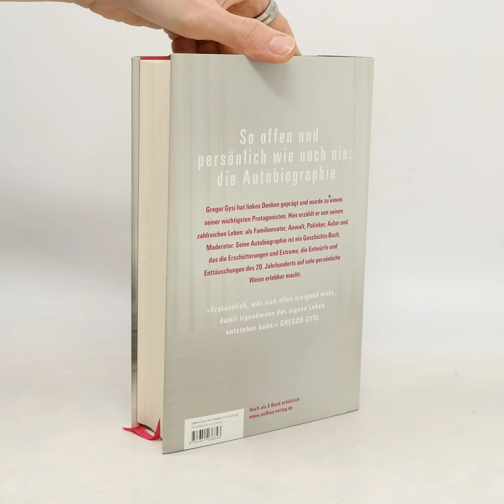 Gregor Gysi hat linkes Denken geprägt und wurde zu einem seiner wichtigsten Protagonisten. Hier erzählt er von seinen zahlreichen Leben: als Familienvater, Anwalt, Politiker, Autor und Moderator. Seine Autobiographie ist ein Geschichts-Buch, das die Erschütterungen und Extreme, die Entwürfe und Enttäuschungen des 20. Jahrhunderts auf sehr persönliche Weise erlebbar macht. „Erstaunlich, was sich alles ereignen muss, damit irgendwann das eigene Leben entstehen kann.“ Gregor Gysi