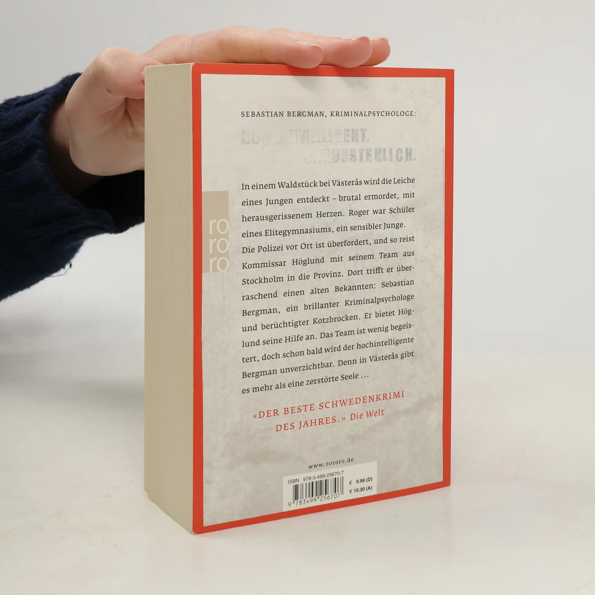 Sebastian Bergman, Kriminalpsychologe: Hochintelligent. Unausstehlich. In einem Waldstück bei Västerås wird die Leiche eines Jungen entdeckt – brutal ermordet, mit herausgerissenem Herzen. Roger war Schüler eines Elitegymnasiums, ein sensibler Junge. Die Polizei vor Ort ist überfordert, und so reist Kommissar Höglund mit seinem Team aus Stockholm in die Provinz. Dort trifft er überraschend einen alten Bekannten: Sebastian Bergman, ein brillanter Kriminalpsychologe und berüchtigter Kotzbrocken. Er bietet Höglund seine Hilfe an. Das Team ist wenig begeistert, doch schon bald wird der hochintelligente Bergman unverzichtbar. Denn in Västerås gibt es mehr als eine zerstörte Seele ... Sebastian Bergmans erster Fall