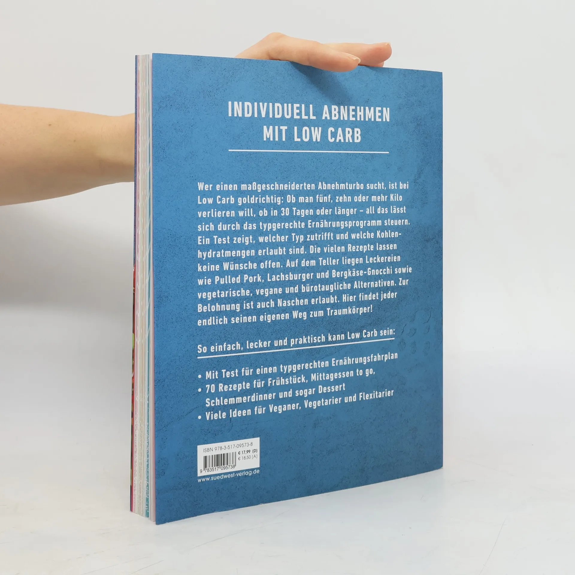 Individuell abnehmen mit Low Carb High Fat Wer einen maßgeschneiderten Abnehmturbo sucht, ist bei Low Carb richtig: Ob man 5, 10 oder mehr Kilo verlieren will, ob in 30 Tagen oder länger – all das lässt sich durch das typgerechte Ernährungsprogramm steuern. Ein Test zeigt, welcher Typ zutrifft und welche Kohlenhydratmengen erlaubt sind. Auf dem Teller befinden sich Leckereien wie Pulled Pork, Lachsburger und Bergkäse-Gnocchi sowie vegetarische und bürotaugliche Alternativen. Der individuelle Weg zum Traumbody! Ausstattung: ca. 50 Farbfotos; ca. 50 Farbfotos