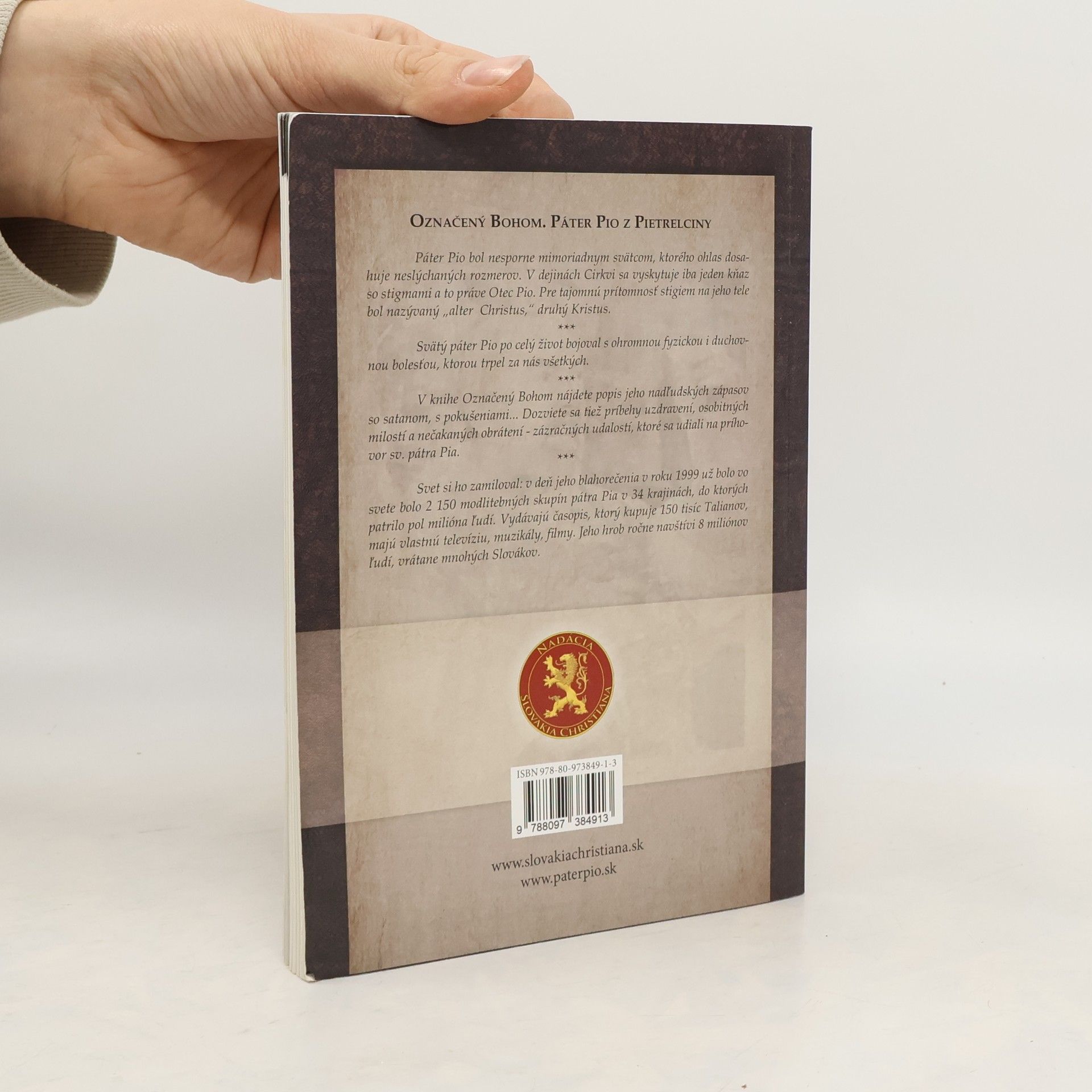 Páter Pio bol nesporne mimoriadnym svätcom, ktorého ohlas dosahuje neslýchaných rozmerov. V dejinách cirkvi sa vyskytuje iba jeden kňaz so stigmami a to práve Otec Pio. Pre tajomnú prítomnosť stigiem na jeho tele bol nazývaný "alter Christus", druhý Kristus. Svätý páter Pio po celý život bojoval s ohromnou fyzickou i duchovnou bolesťou, ktorou trpel za nás všetkých. V knihe Označený Bohom nájdete popis jeho nadľudských zápasov so satanom, s pokušeniami...Dozviete sa tiež príbehy o uzdravení, osobitných milostí a nečakaných obrátení - zázračných udalostí, ktoré sa udiali na príhovor sv. pátra Pia.